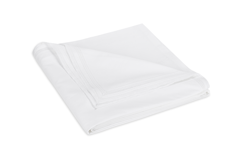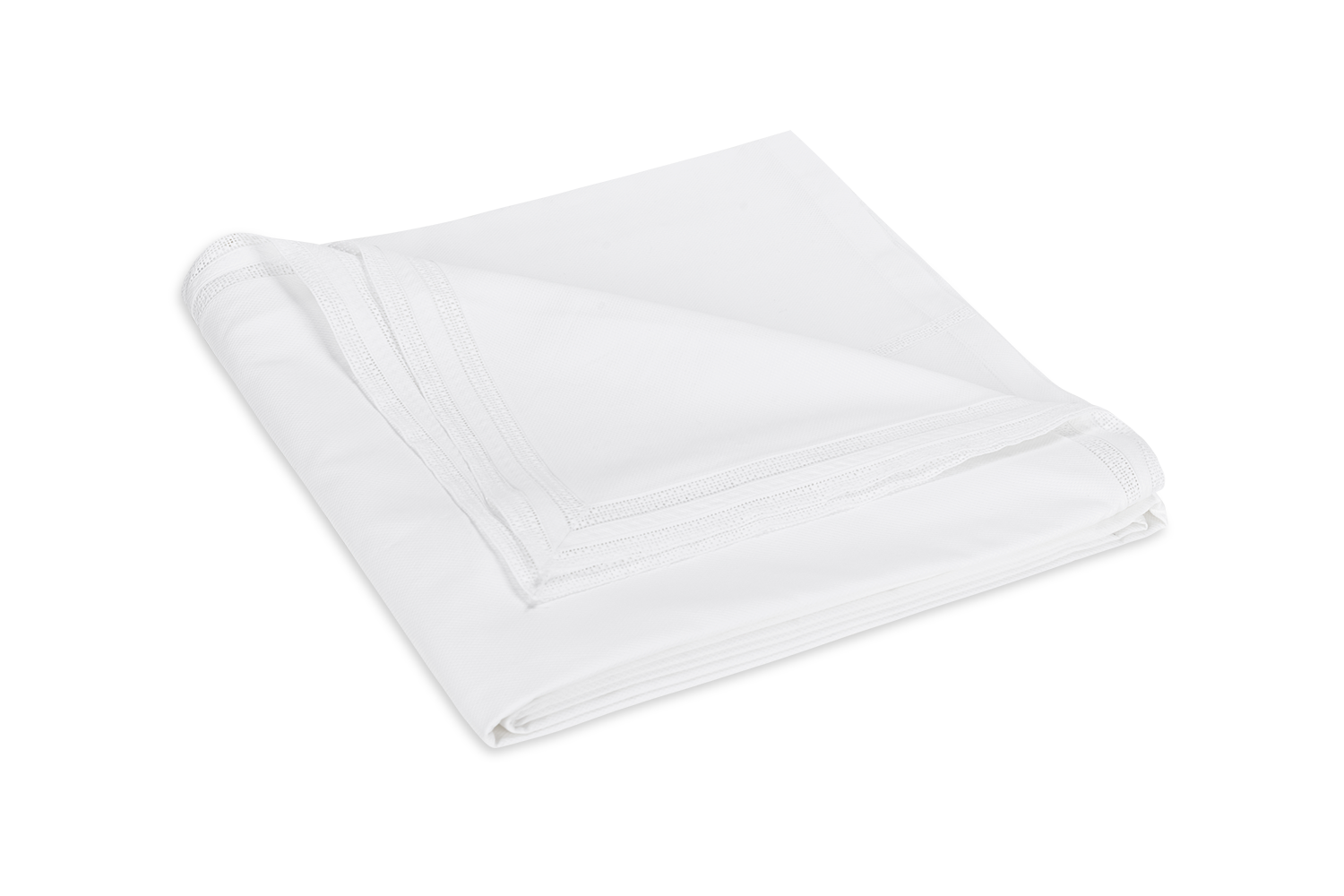 Combining Matouk's white Camilla pique fabric and their beautiful Grace white Swiss lace creates a lovely lightweight layer that adds a perfect polished finish to the bed.
