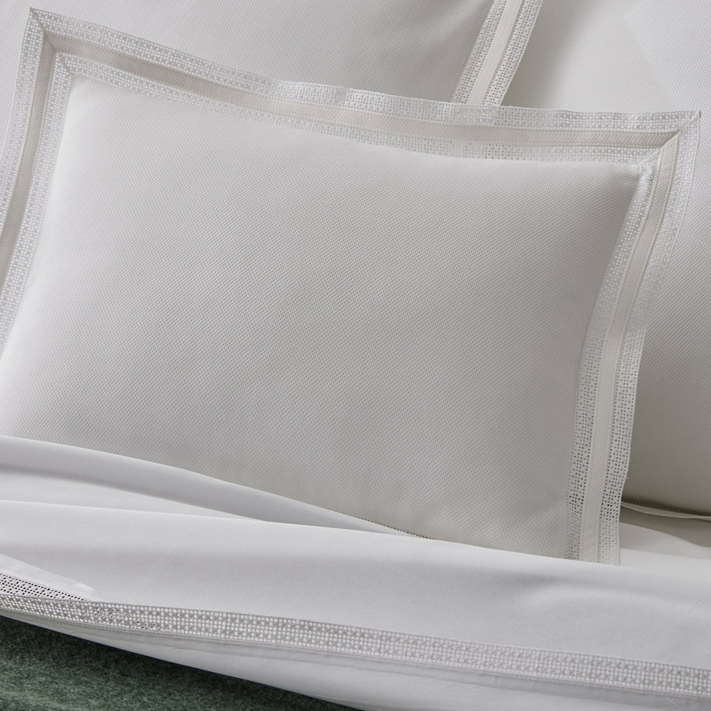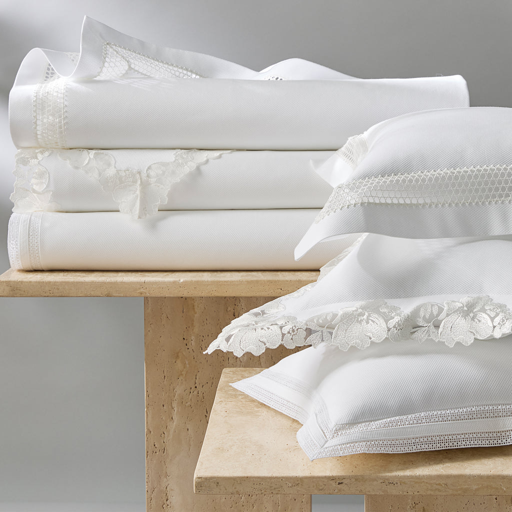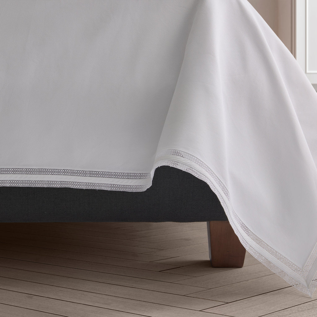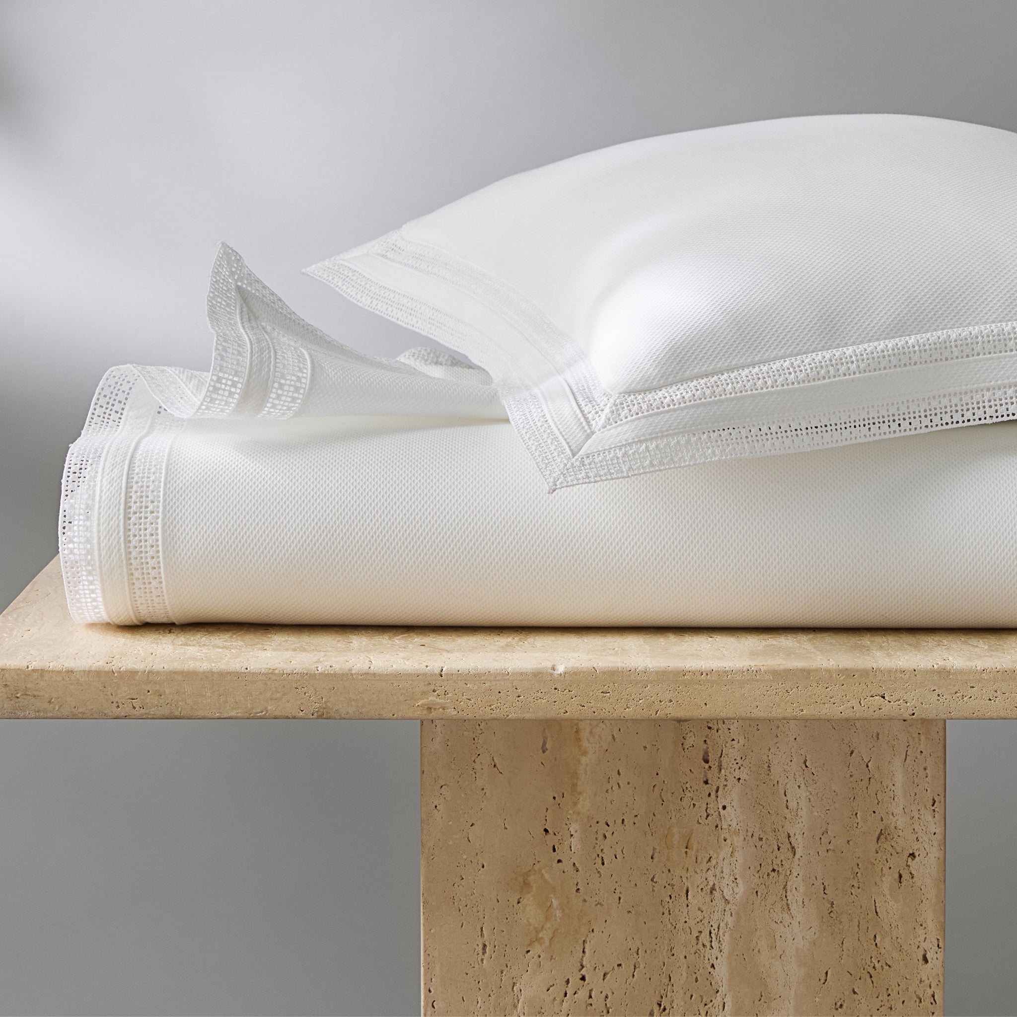 Combining Matouk's white Camilla pique fabric and their beautiful Grace white Swiss lace creates a lovely lightweight layer that adds a perfect polished finish to the bed.