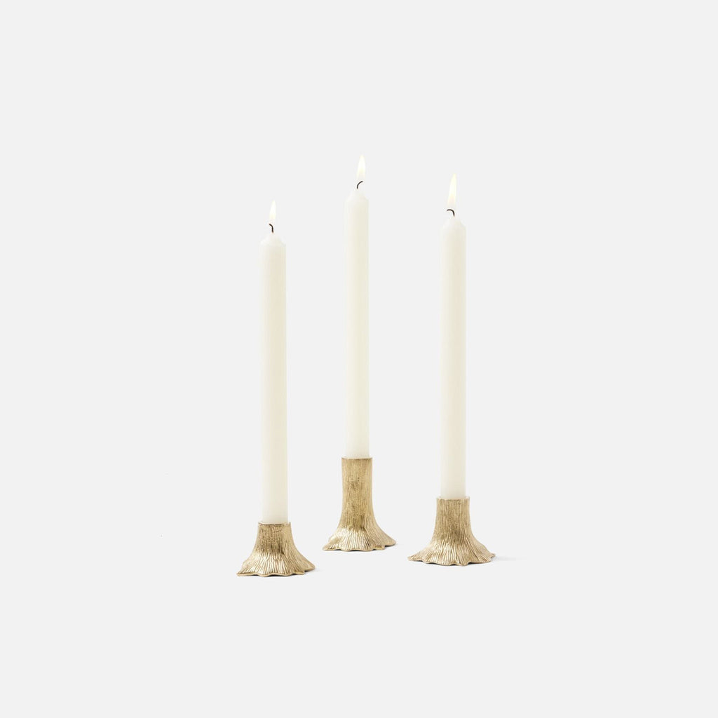 • Organically sculpted brass tree trunk candle bases in varying heights and intricate faux bois detailing finished in gold