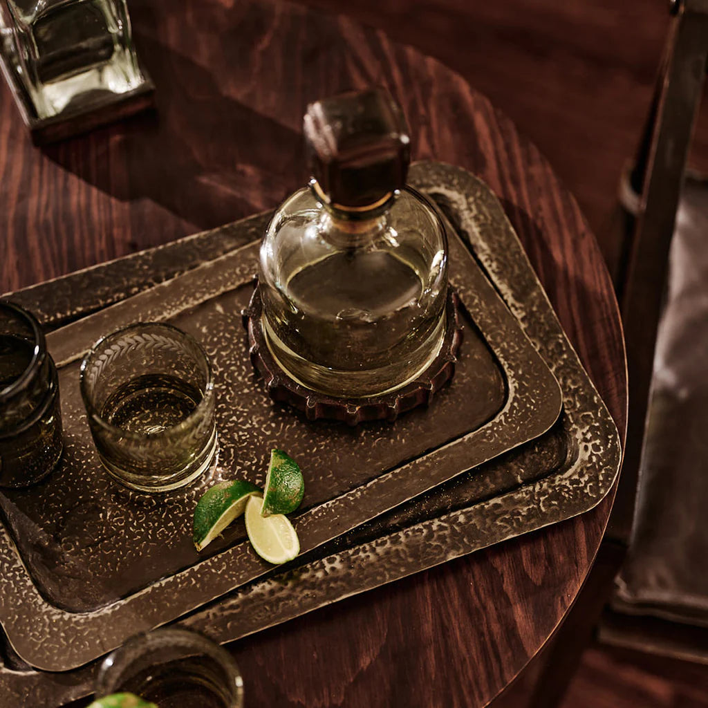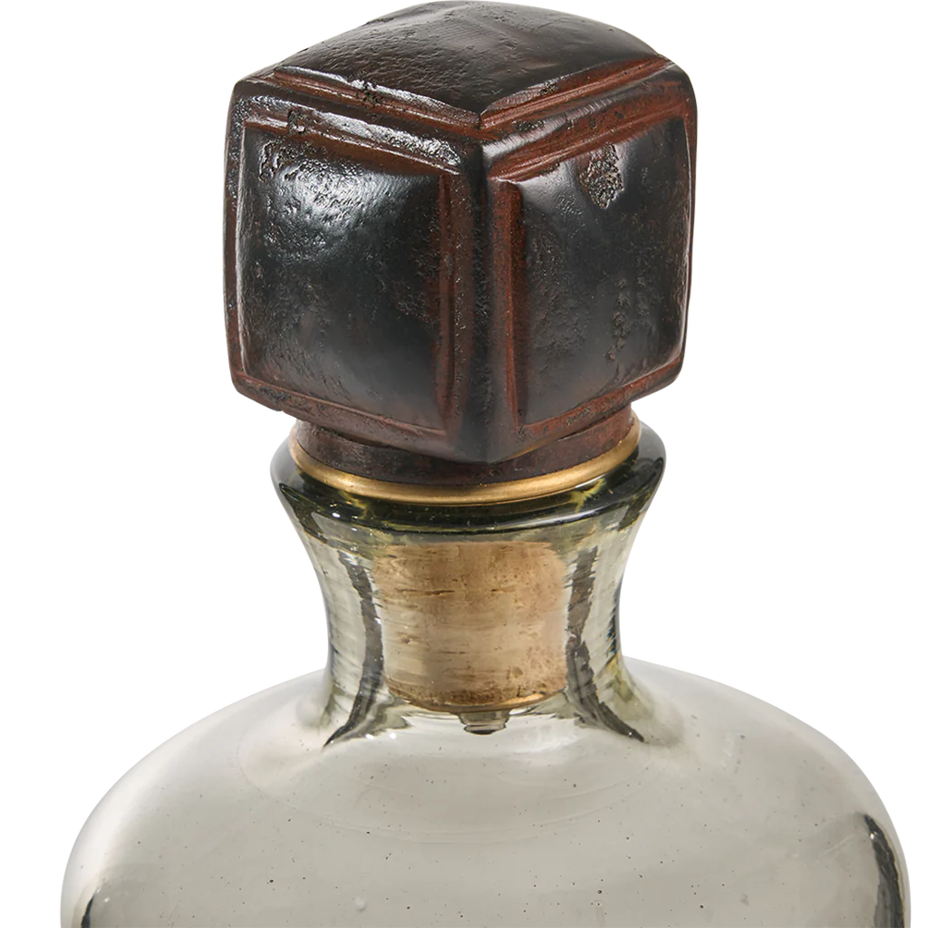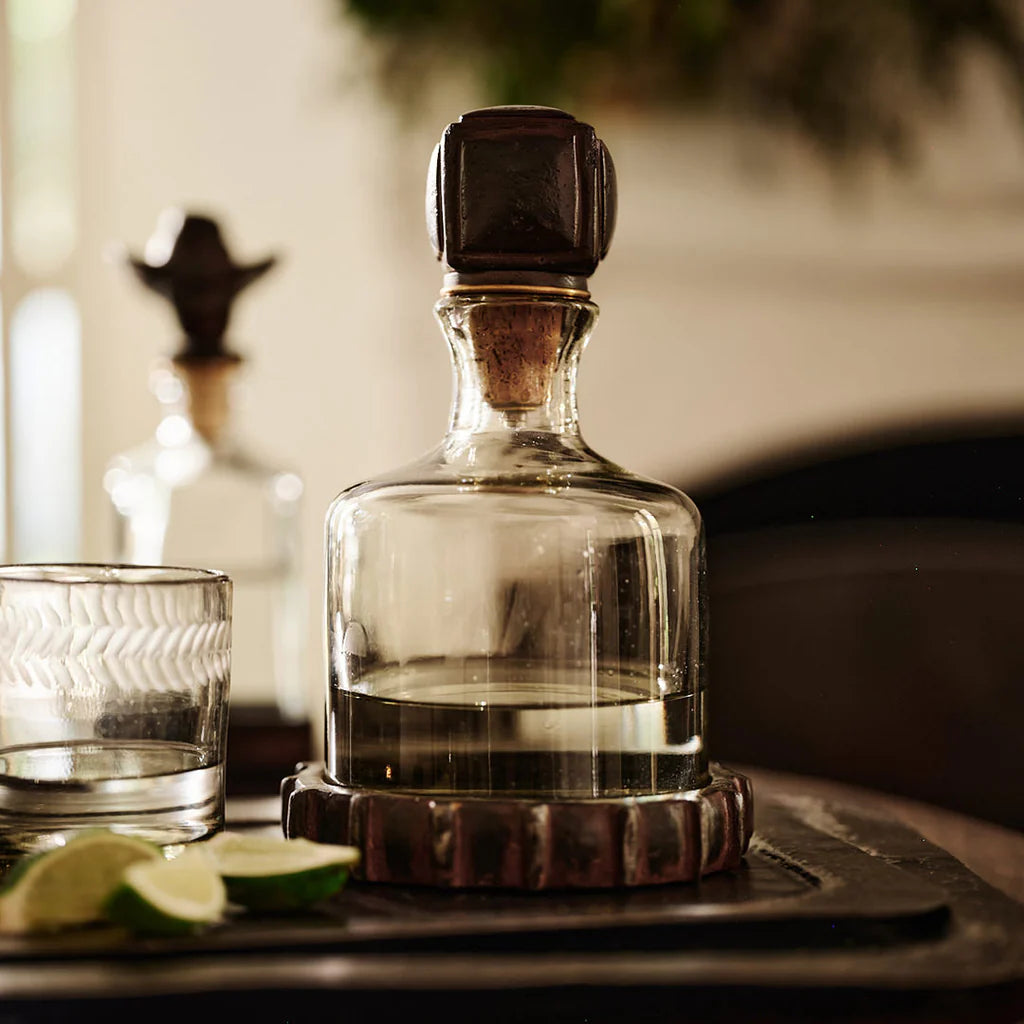 Mouth blown glass decanter with graphic cast iron tray and block topper