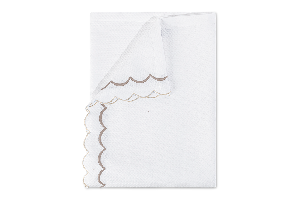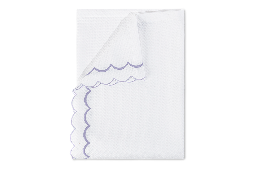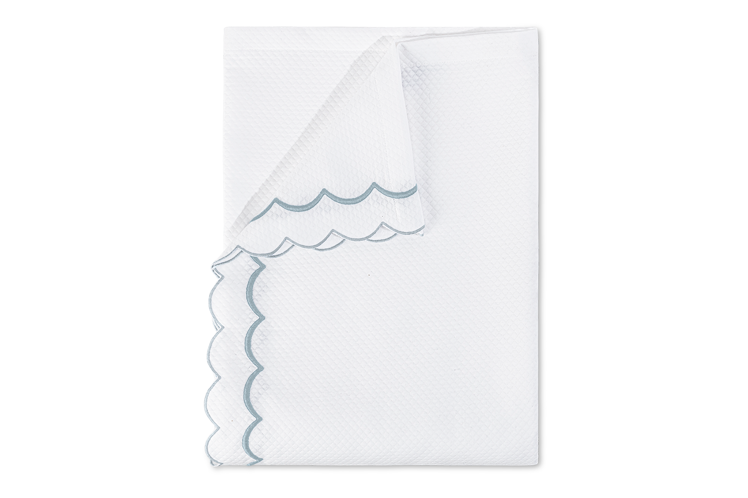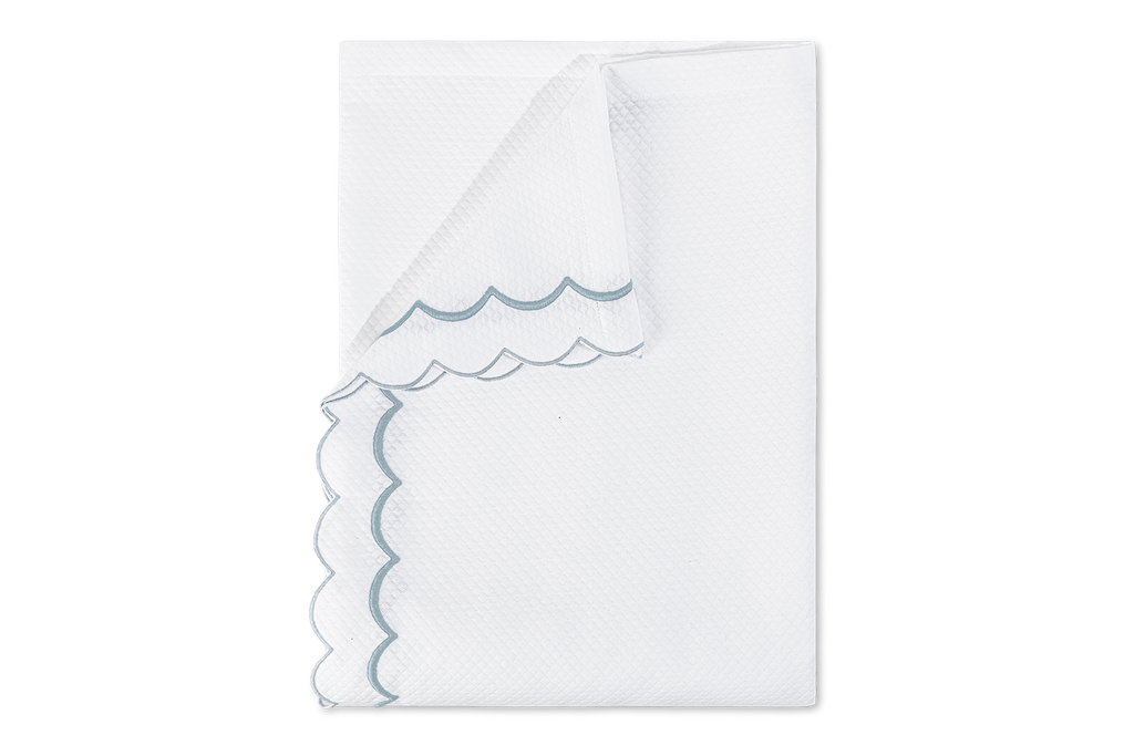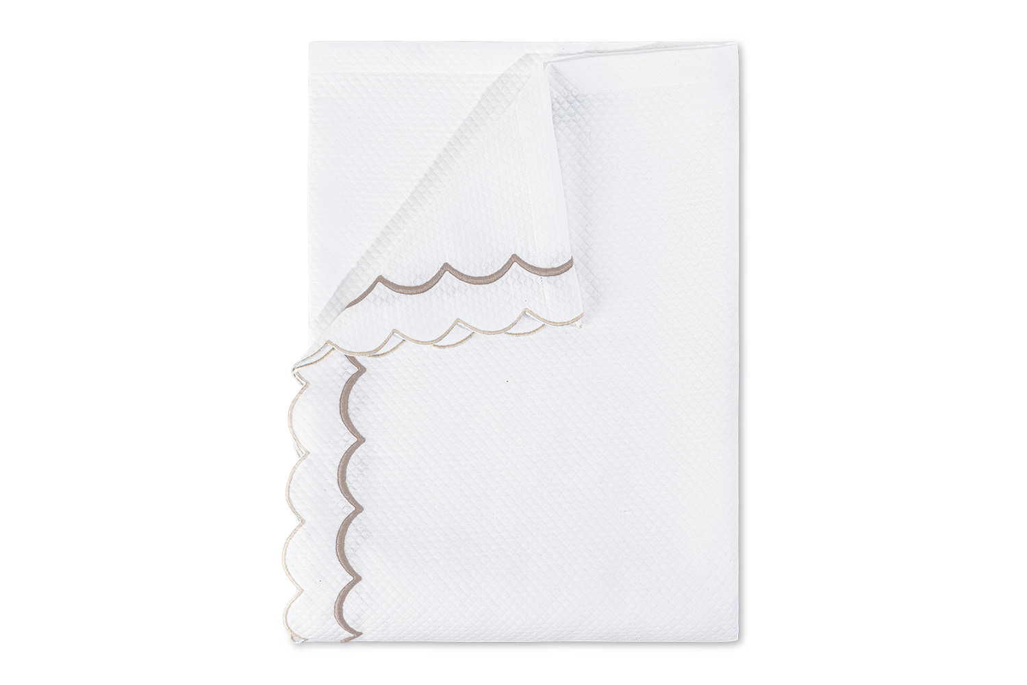Easy care white diamond pique fabric with double scallop embroidery detail on duvet covers, coverlets, bedskirts, and shams.