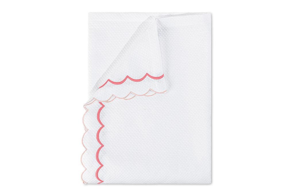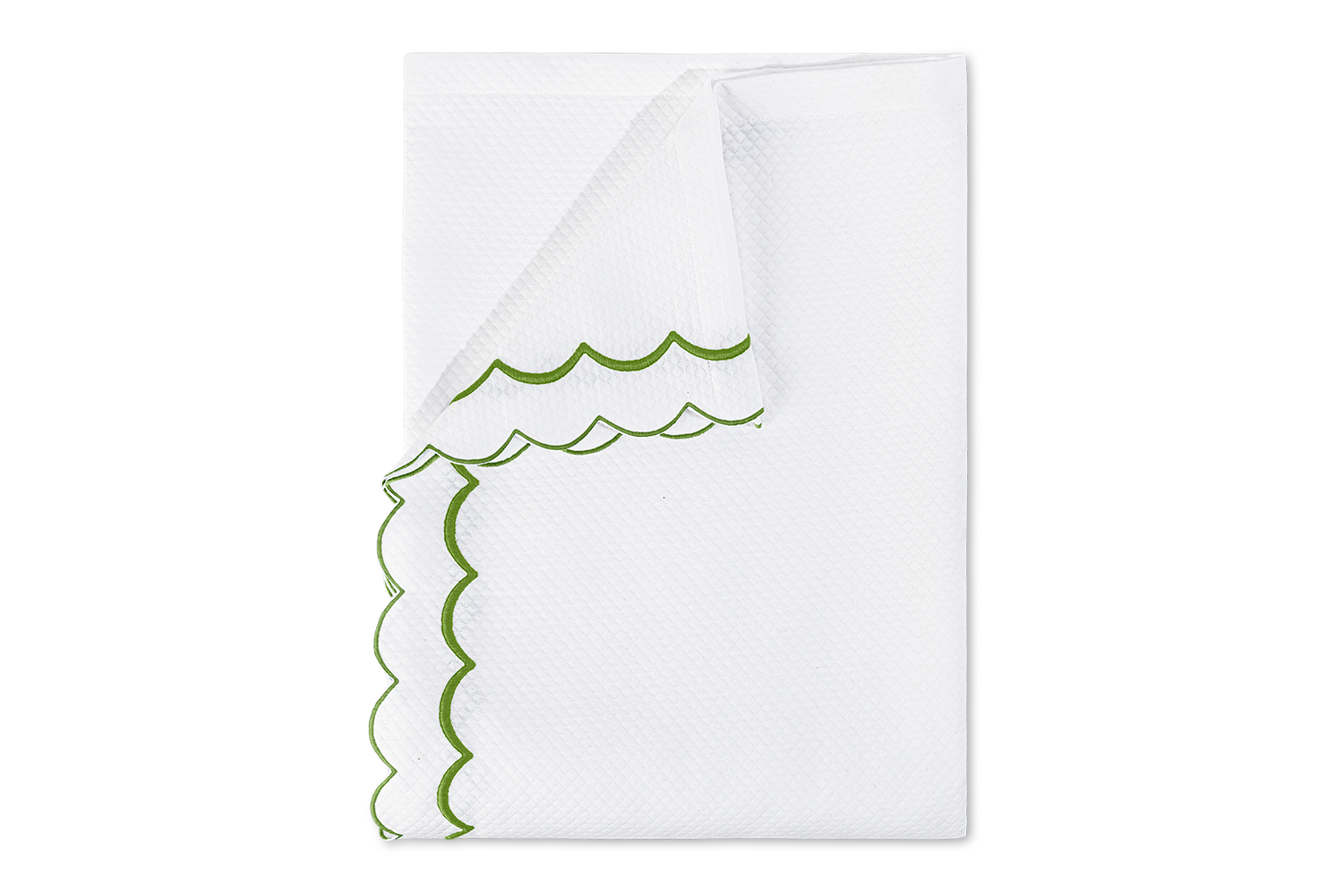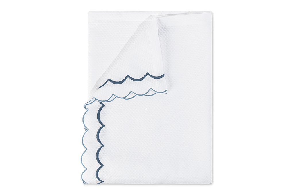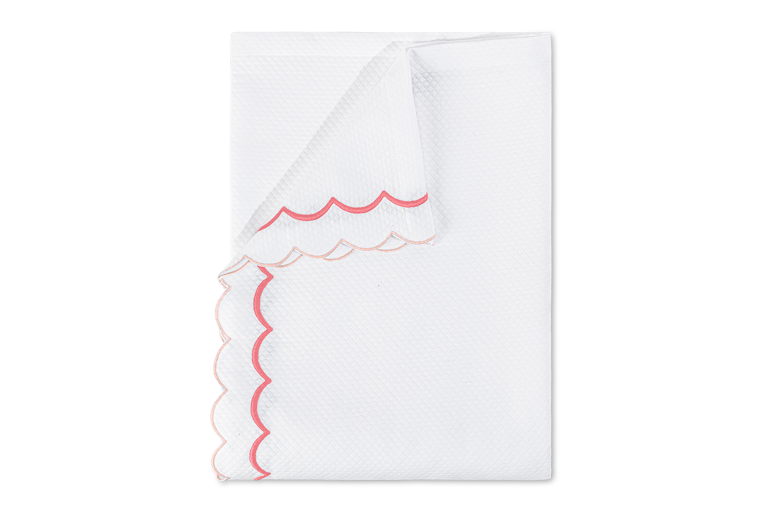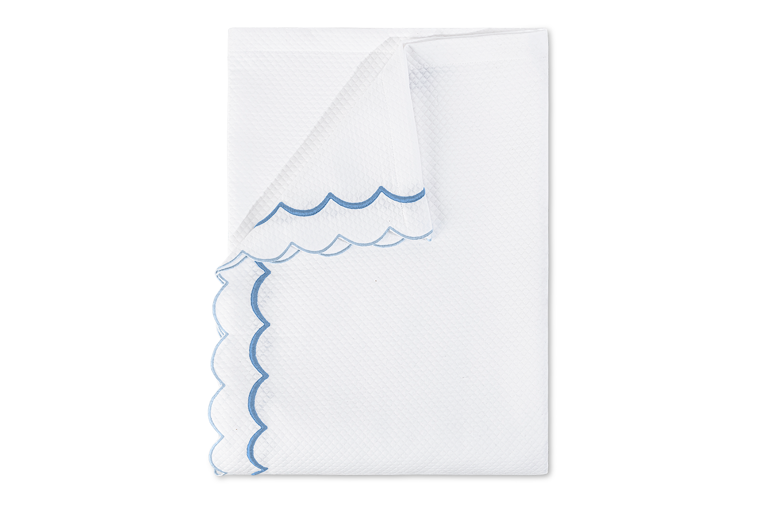 Easy care white diamond pique fabric with double scallop embroidery detail on duvet covers, coverlets, bedskirts, and shams.