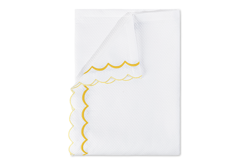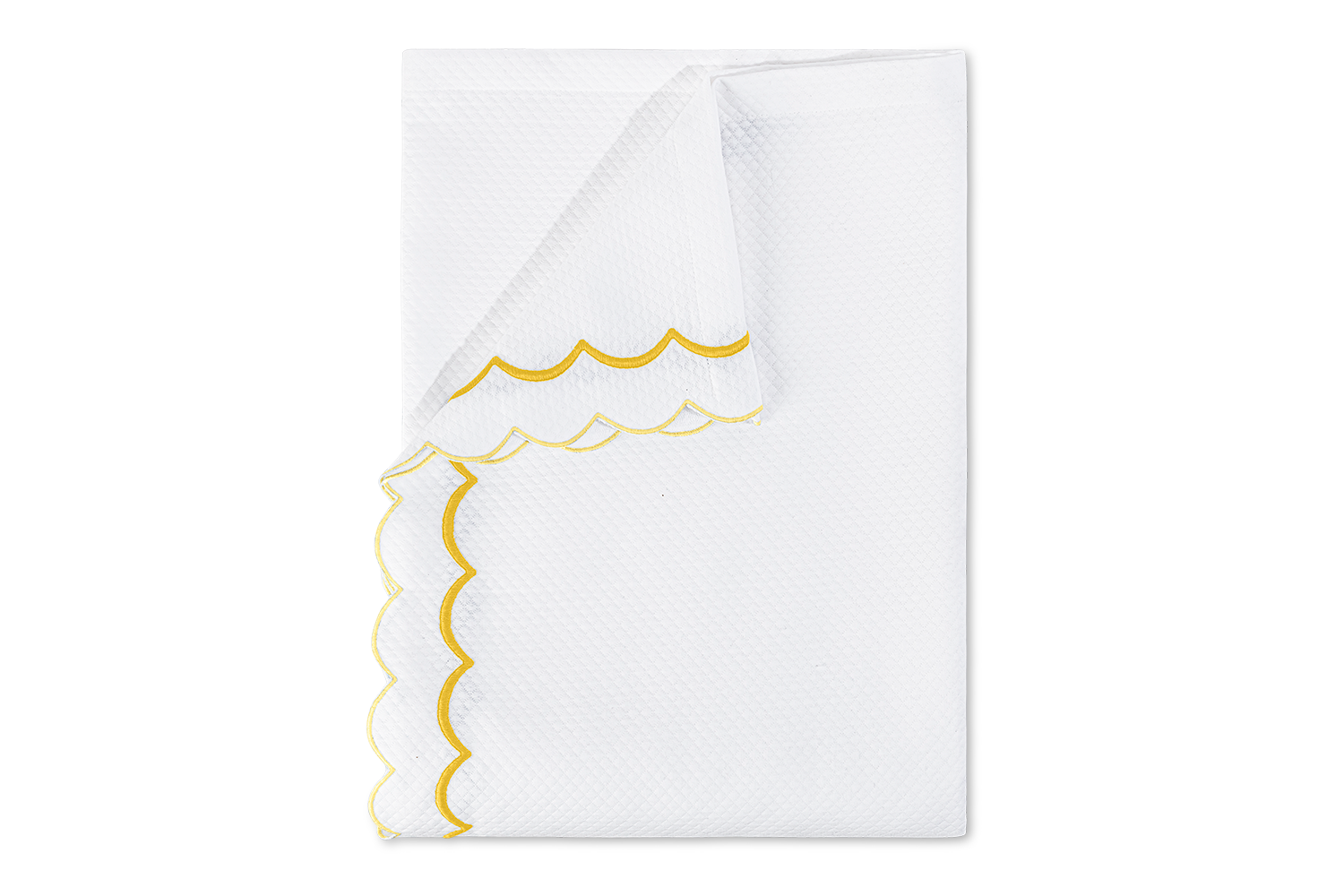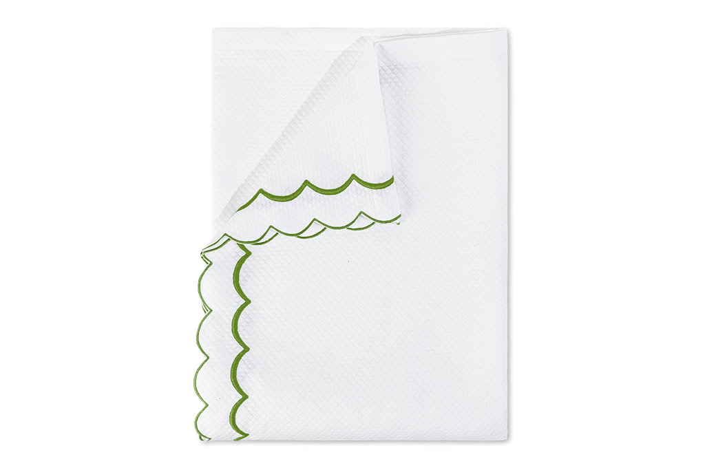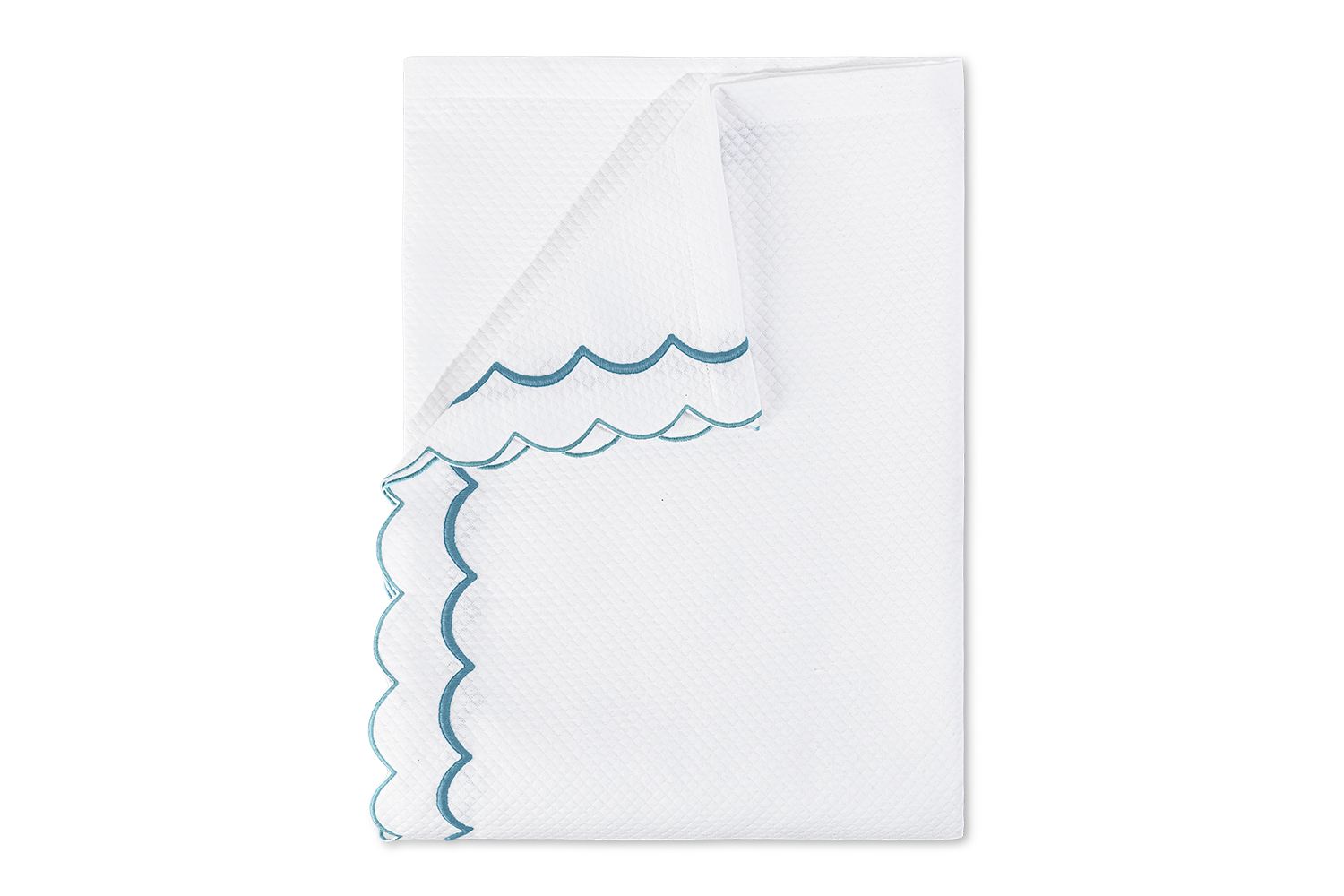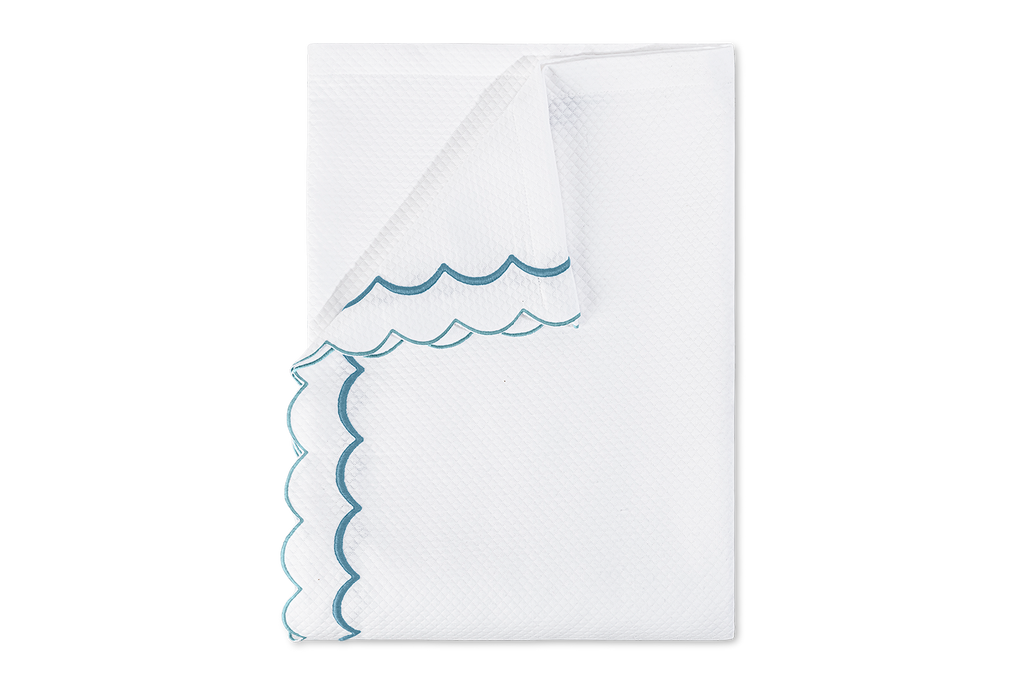 Easy care white diamond pique fabric with double scallop embroidery detail on duvet covers, coverlets, bedskirts, and shams.