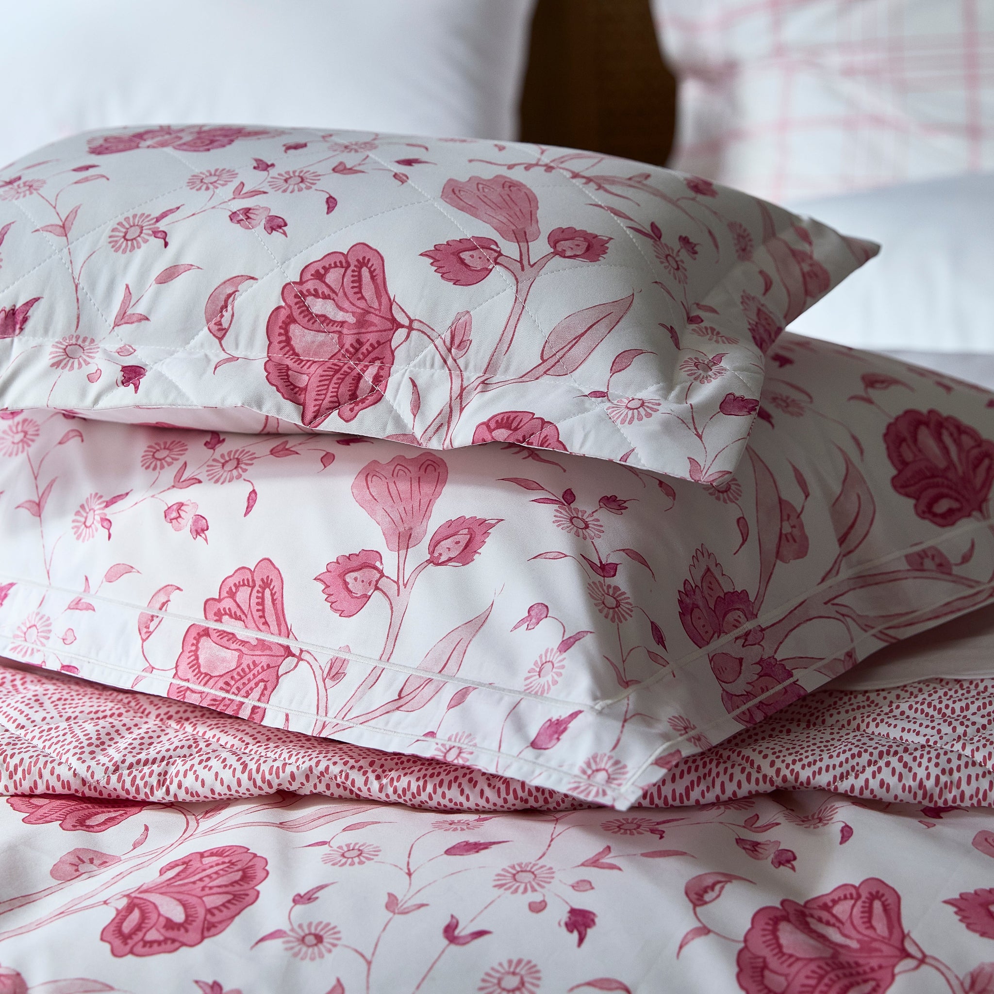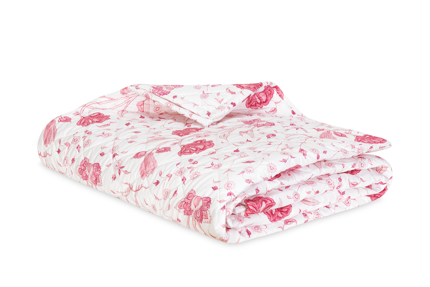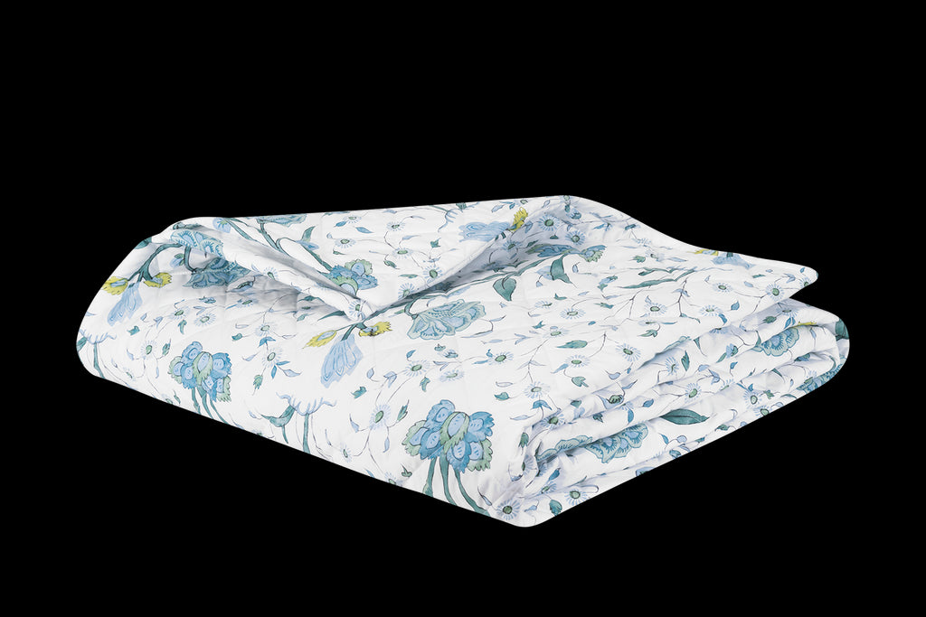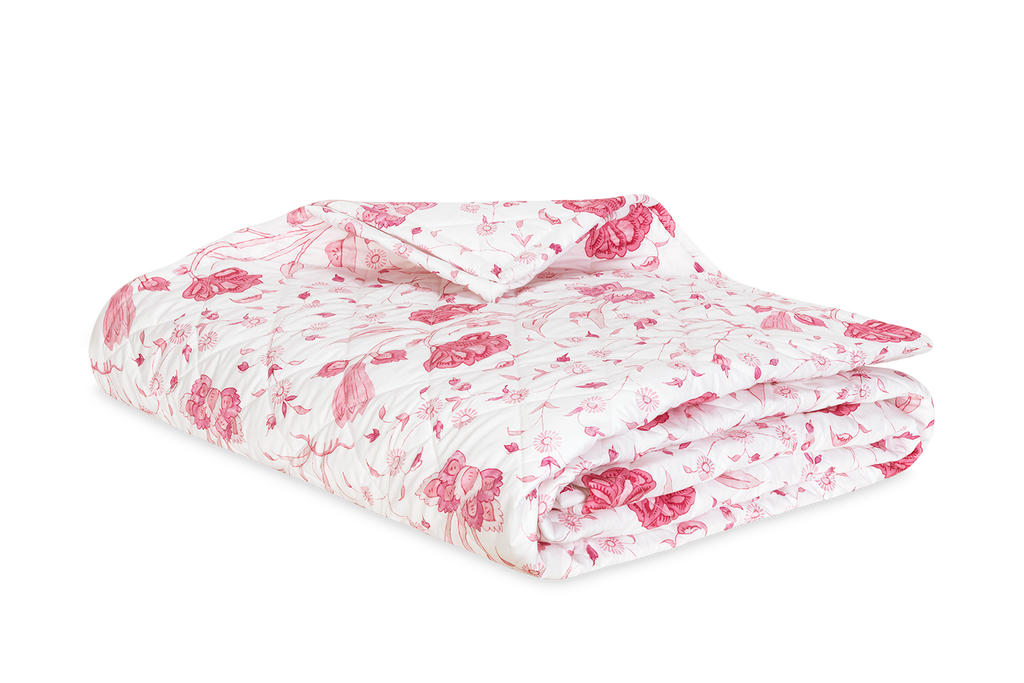 Delightful, large scale Schumacher floral printed on Matouk's Luca percale. Suggests Indian hand-block prints. Quilted in a 4" diamond pattern.
