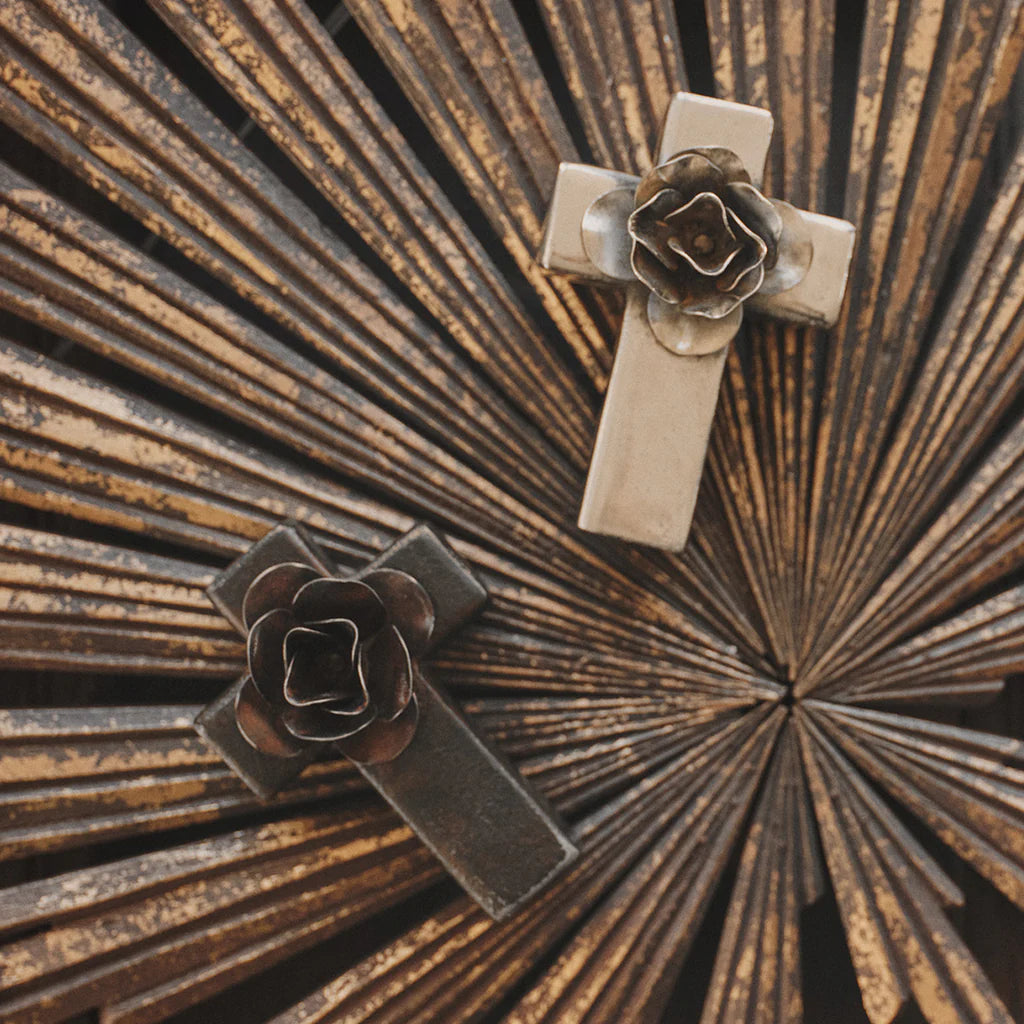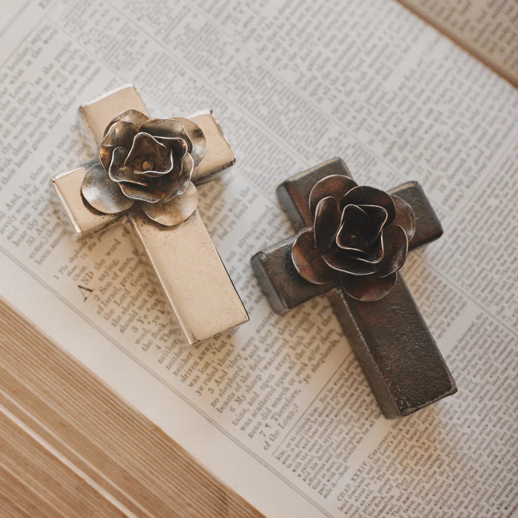 An updated classic... hand rubbed iron cross with tiny rose in German nickel plate