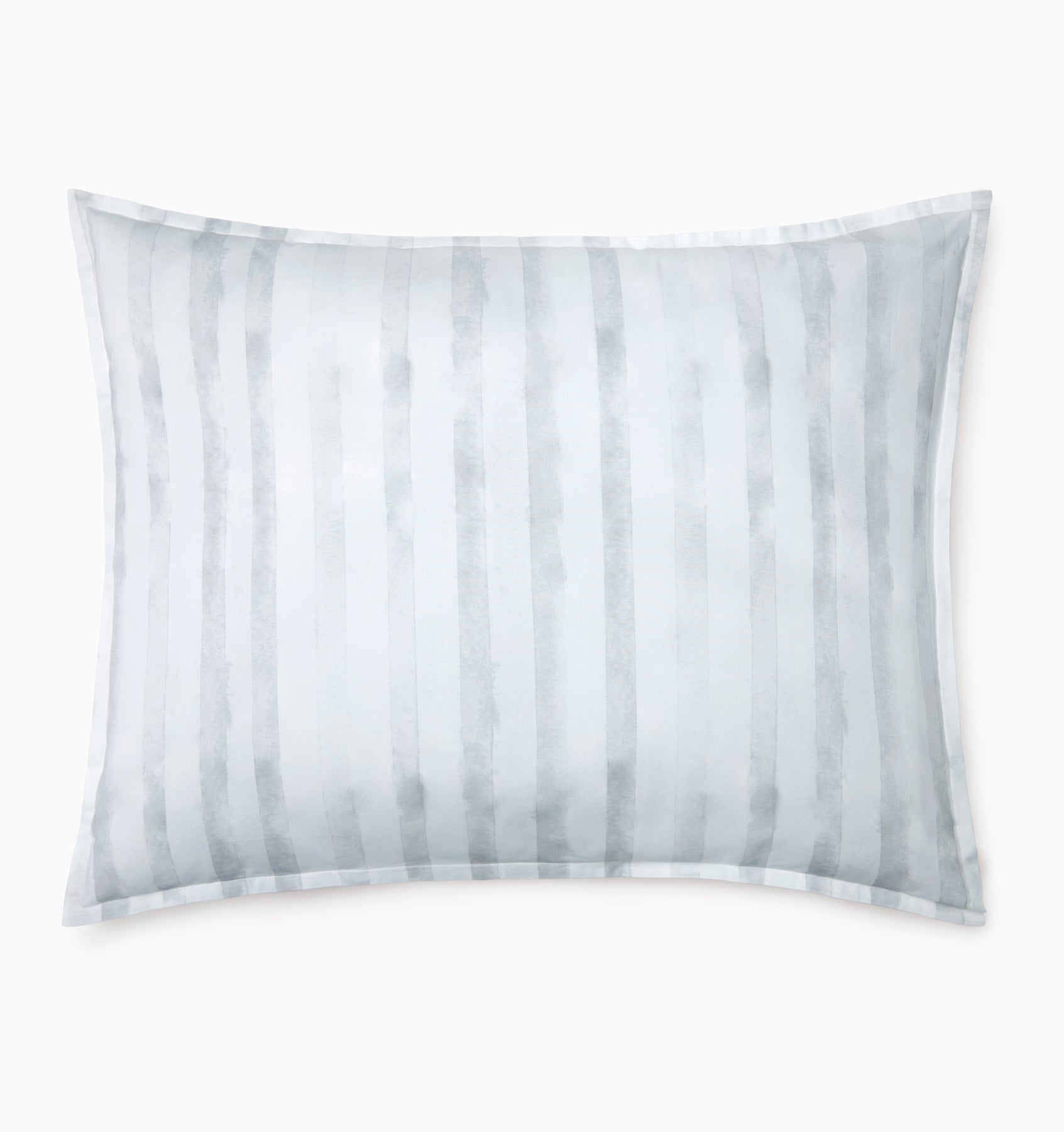 An all-over faded watercolor stripe adorns Kricia's Italian woven long-staple cotton percale, evoking the soft, sun drenched allure of cabana fabrics. In a lunar palette of blue-gray, each subtle line flows with a painterly grace, while mini flanges add a refined edge to this serene, dreamlike bedding.