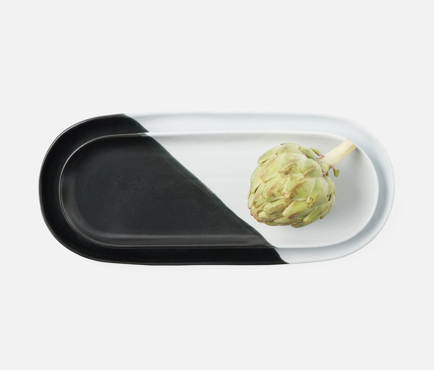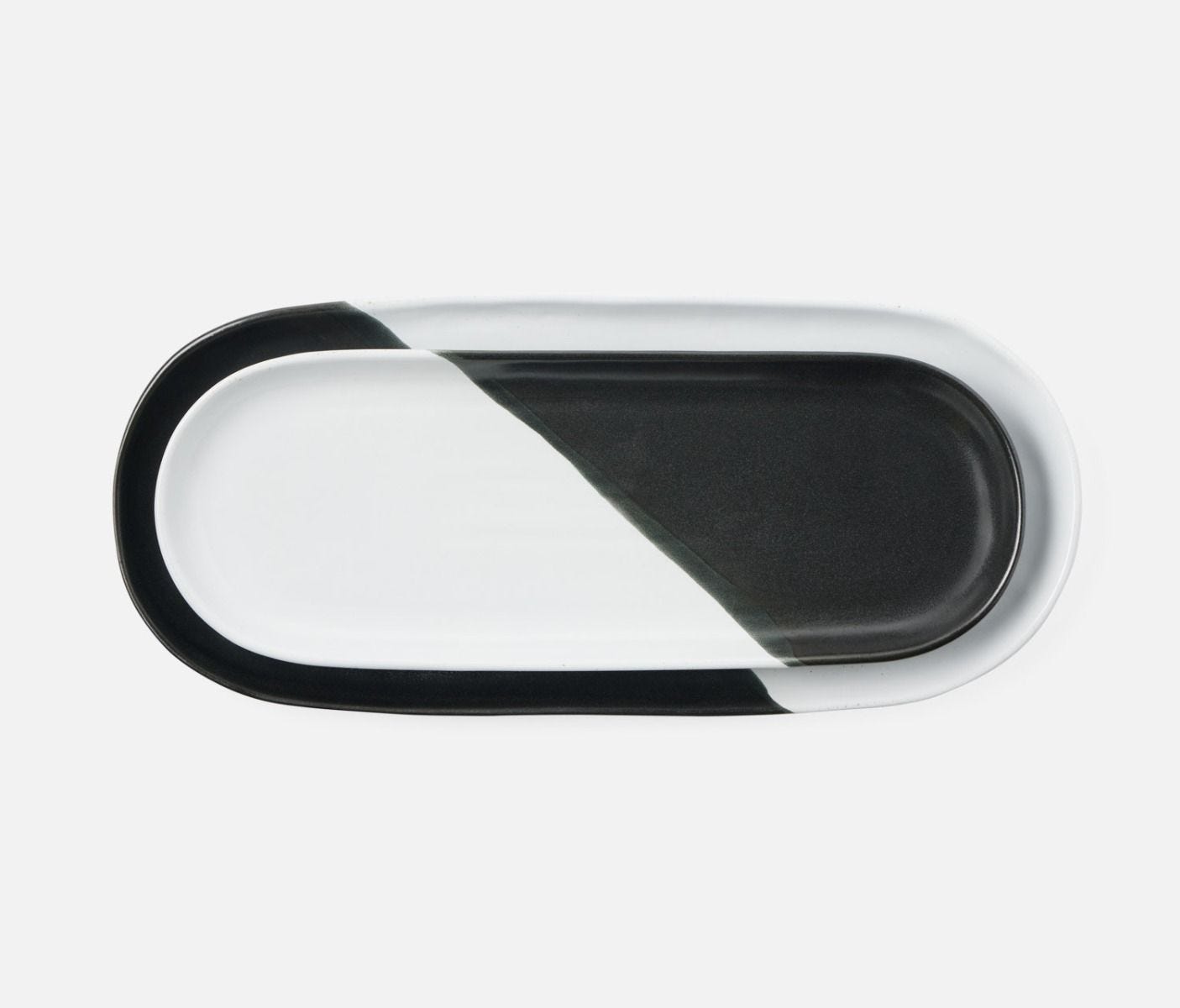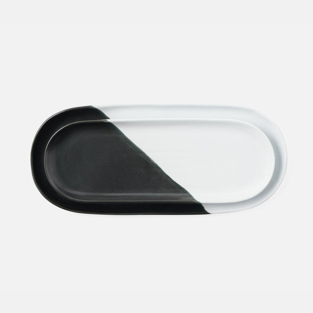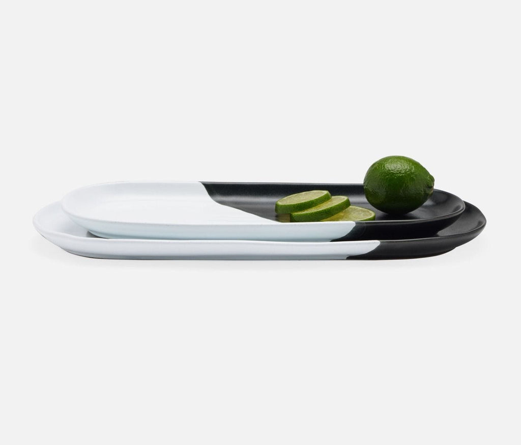 • Stoneware oblong serving platters with black and white glaze
