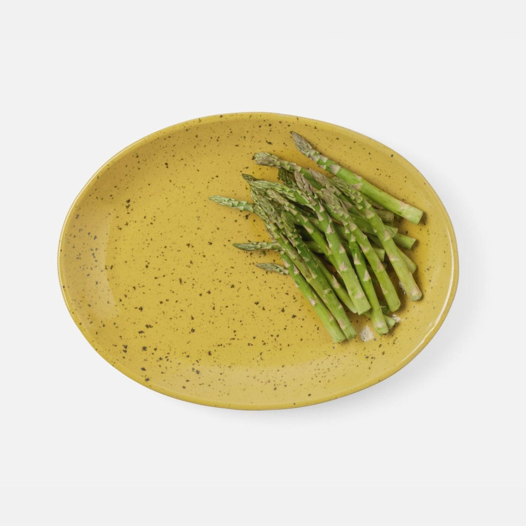 - Oval serving platter set in yellow green chartreuse finish with speckled and splattered salt finish