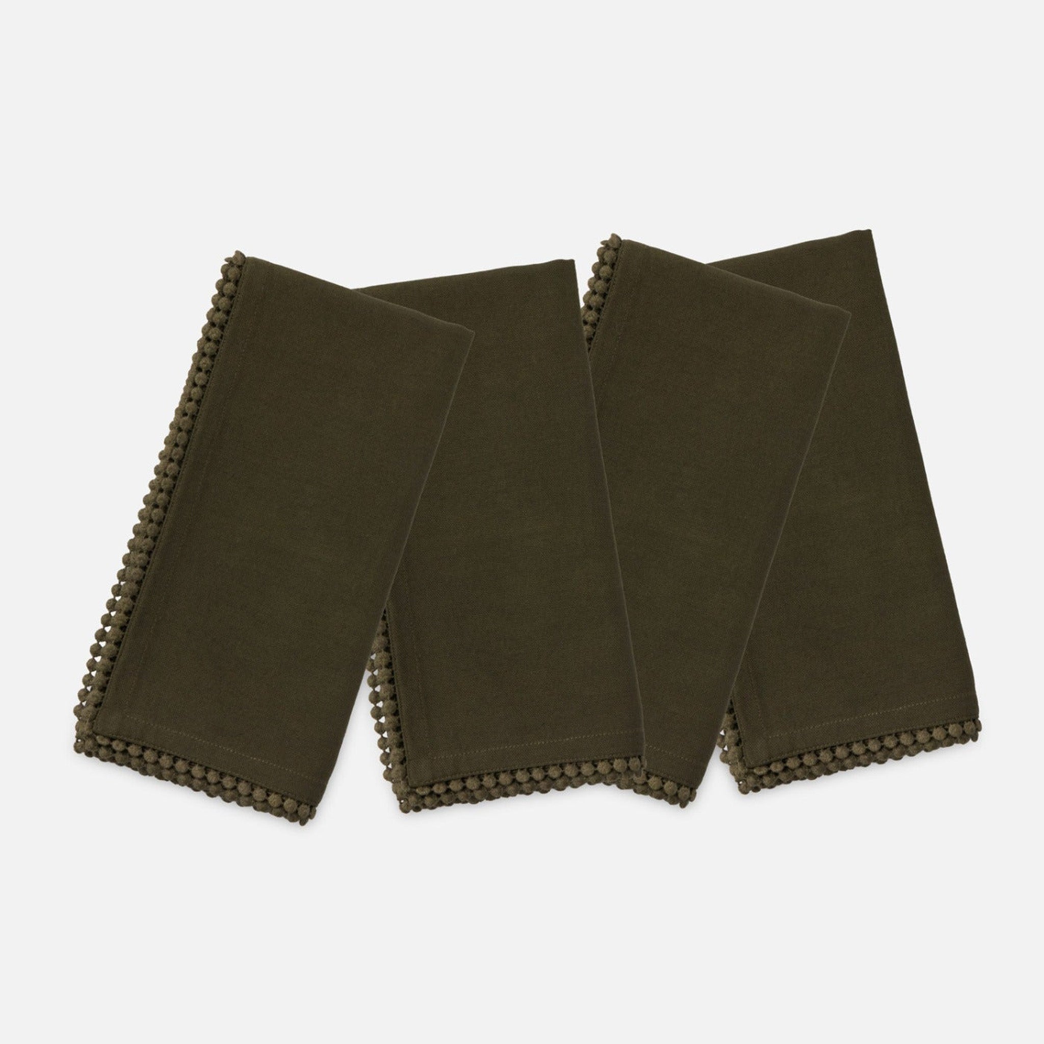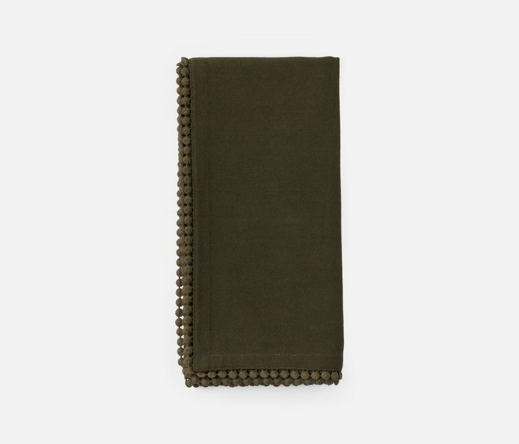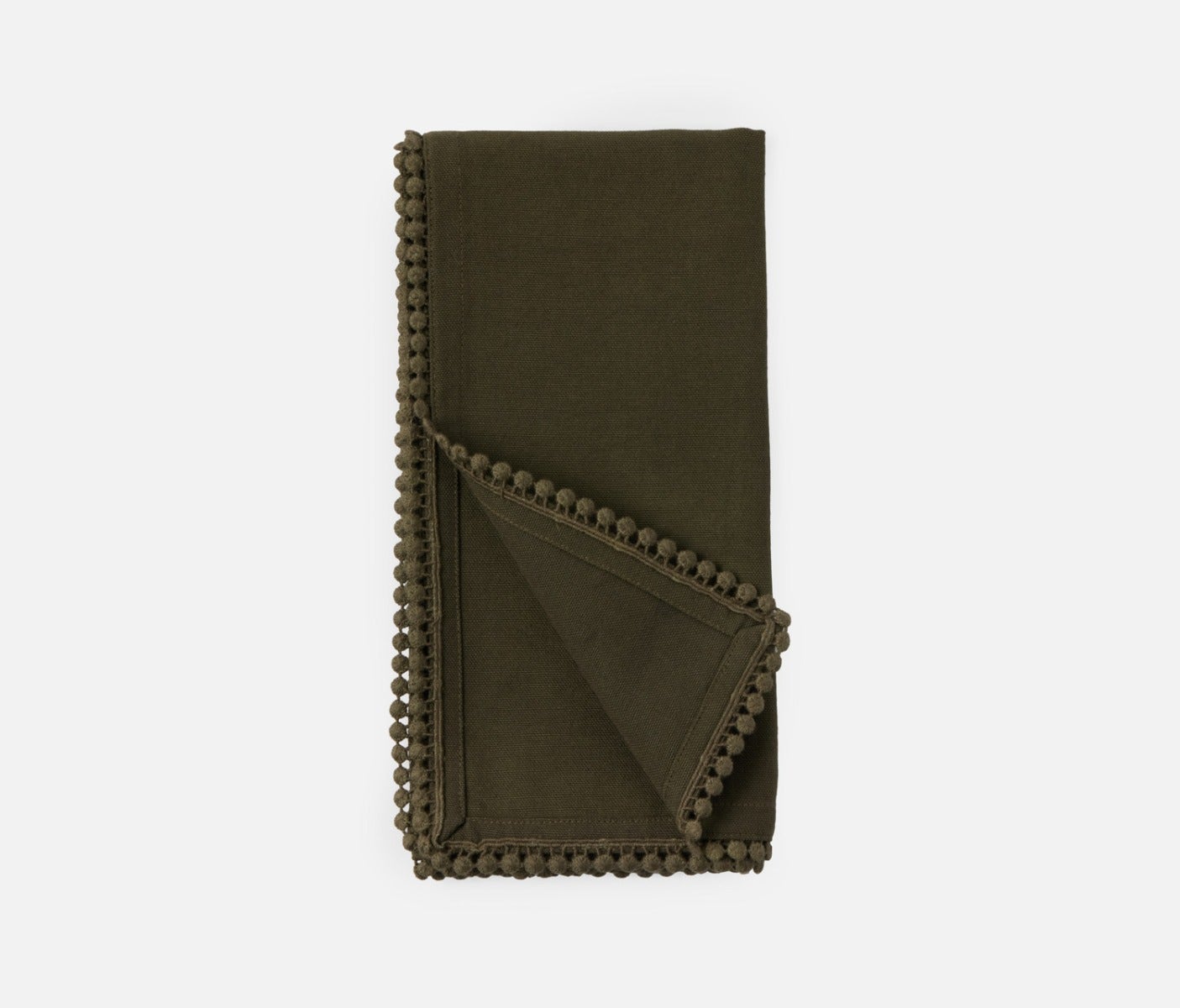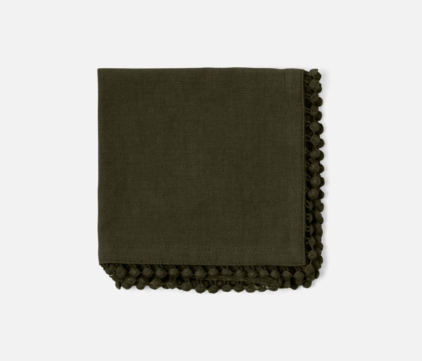 • Cotton canvas cloth napkin with pom pom border in dark olive green shade