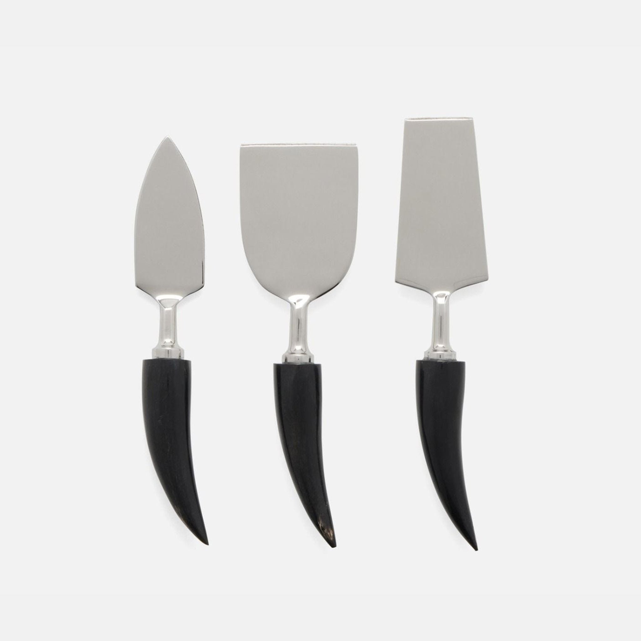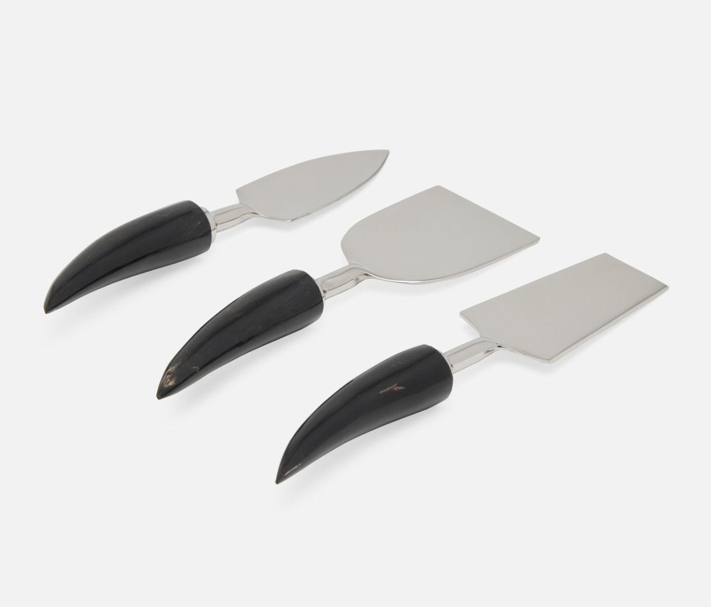 - 3 piece cheese knife set with curved black horn handles and stainless steel blade and polished silver finish