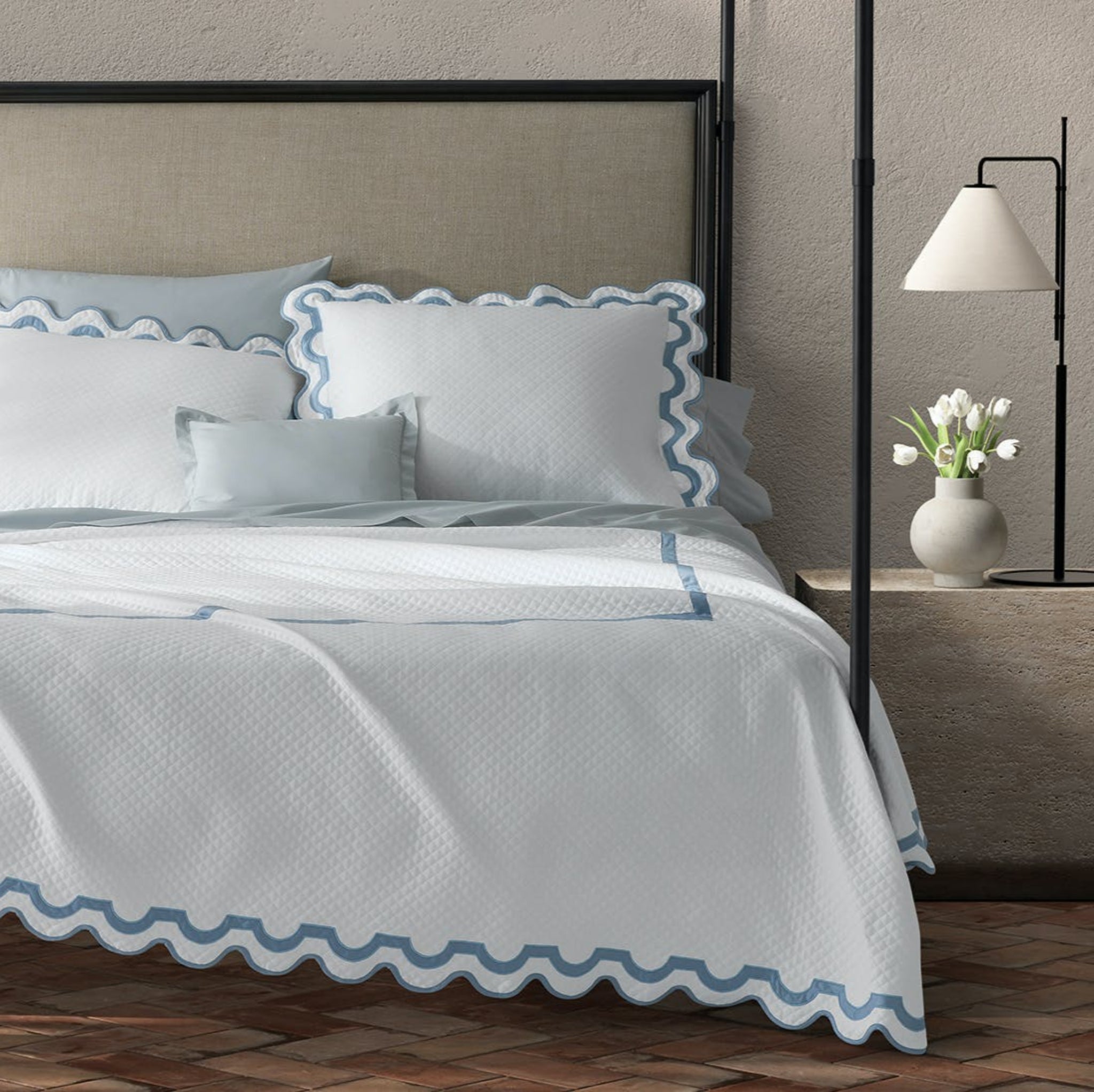 Matouk's signature diamond matelassé design is infused with the radiant energy of our Mirasol appliqué—an iconic Palm Beach-inspired motif