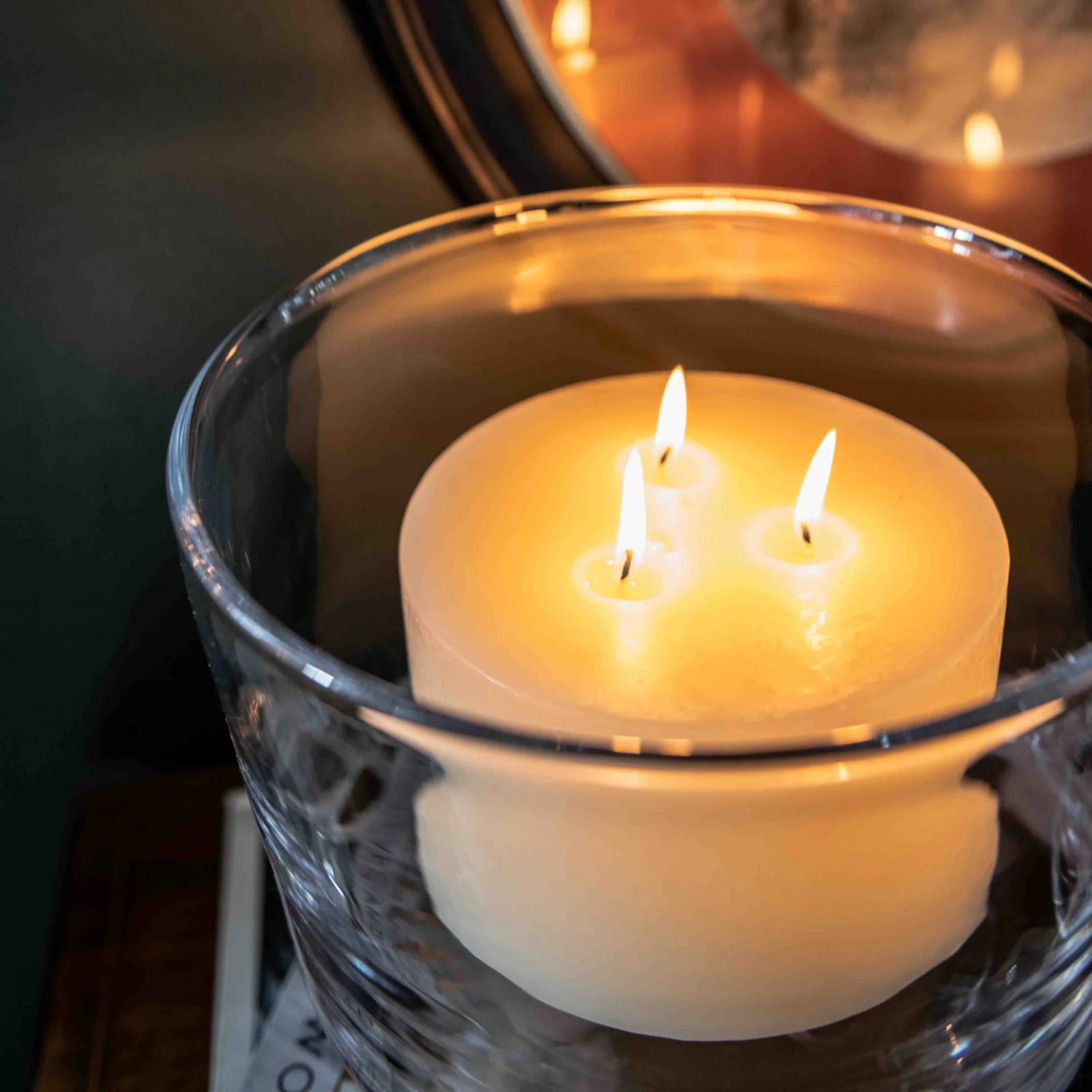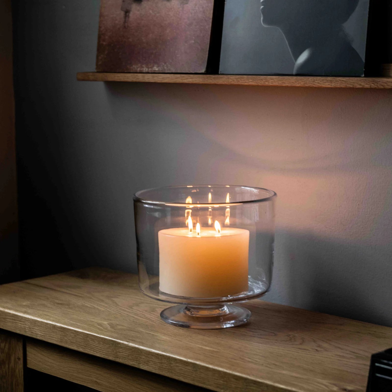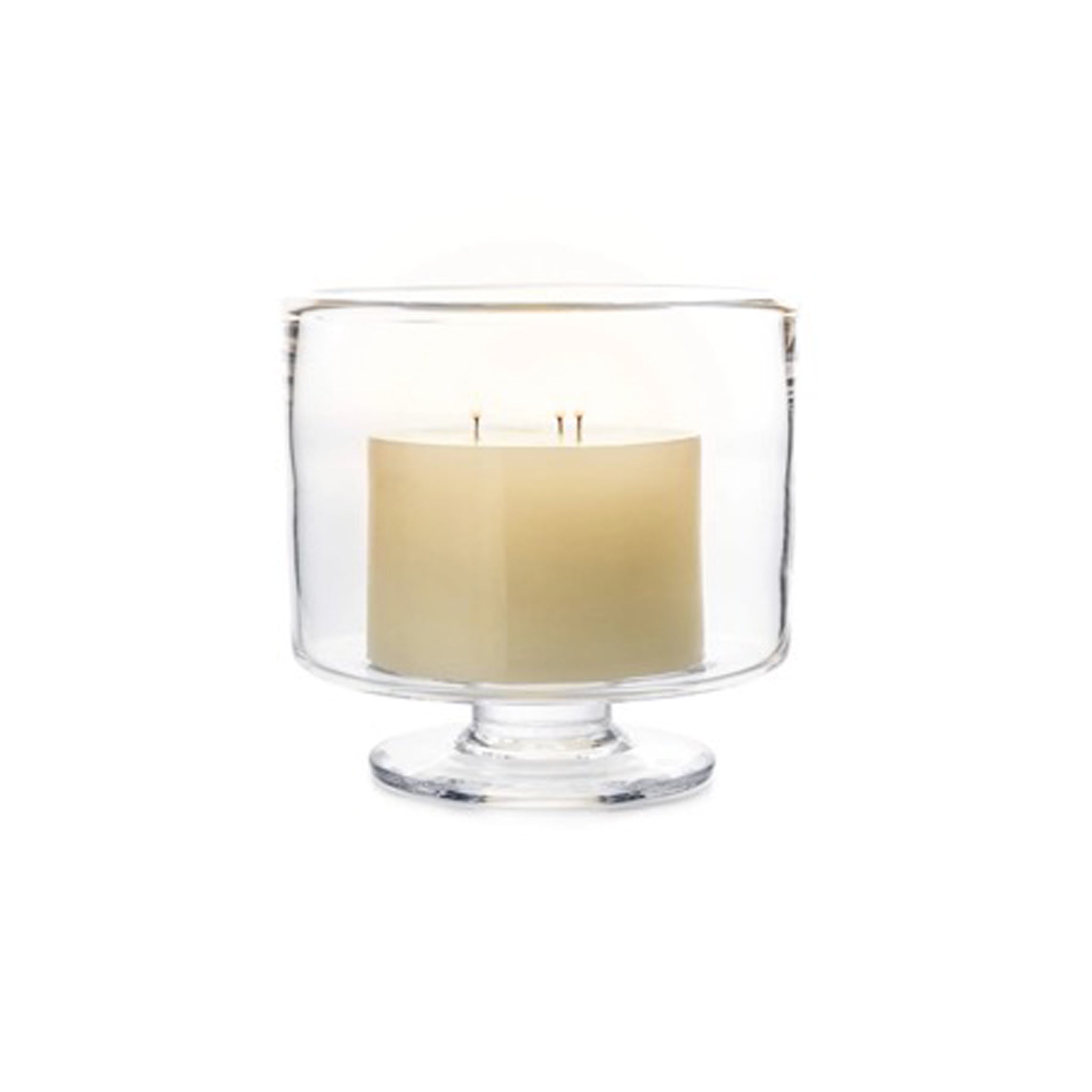 Care: Clean with glass cleaner and a soft cloth. Extinguish candles before the flame reaches the base. Do not expose glass to extreme heat changes, such as placing in the freezer. A shock in temperature can cause fractures.