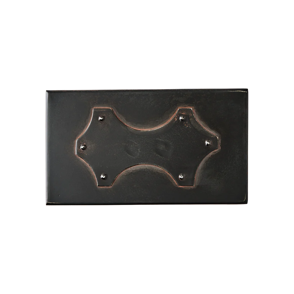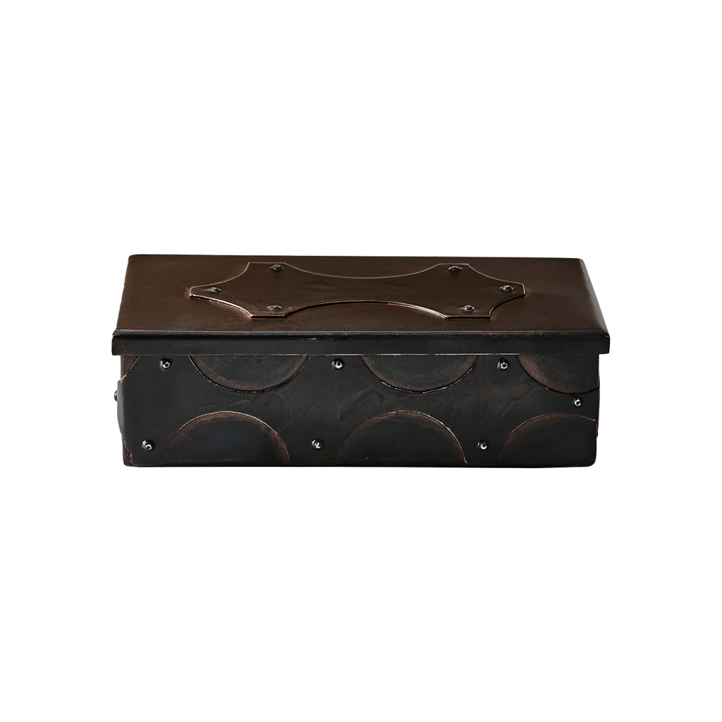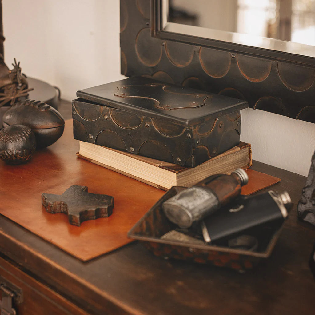 Handsome iron box with iron cut out design and leather insert...great for desk, dresser, coffee table...