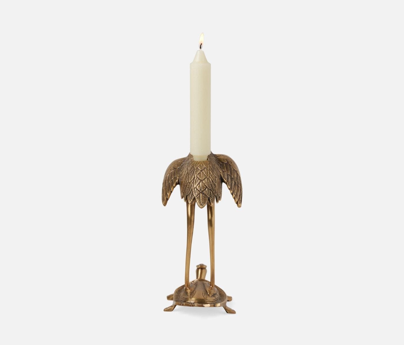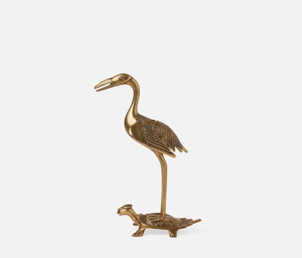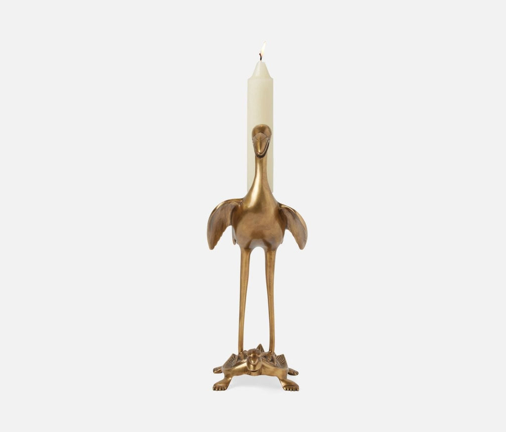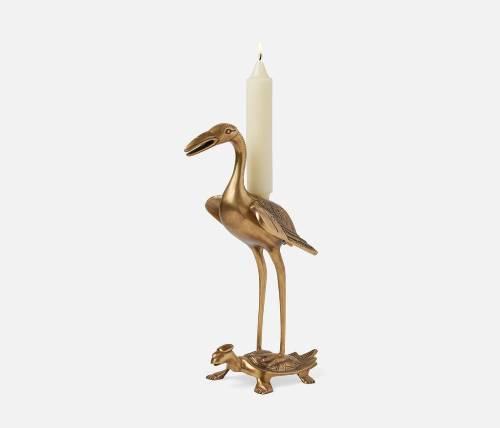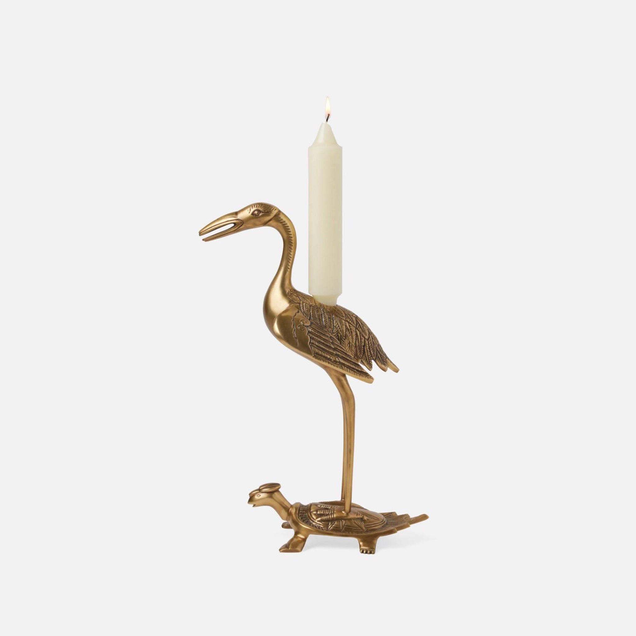 - Gold plated brass candle holder featuring a crane standing on a turtle