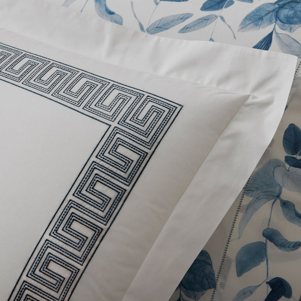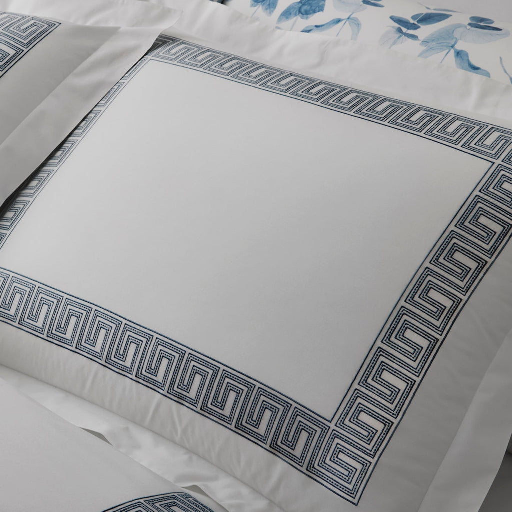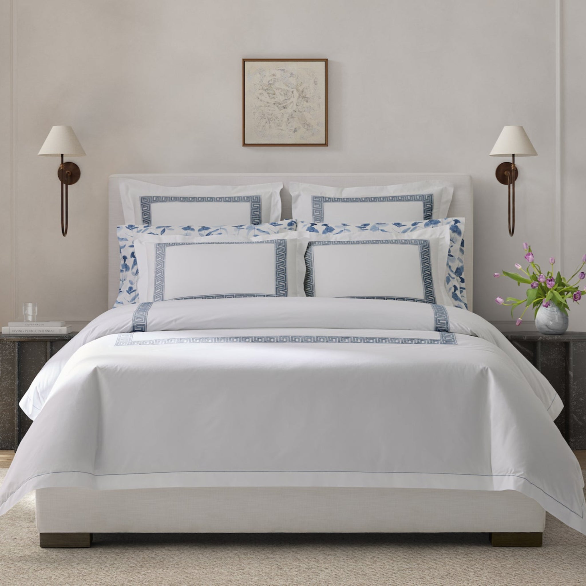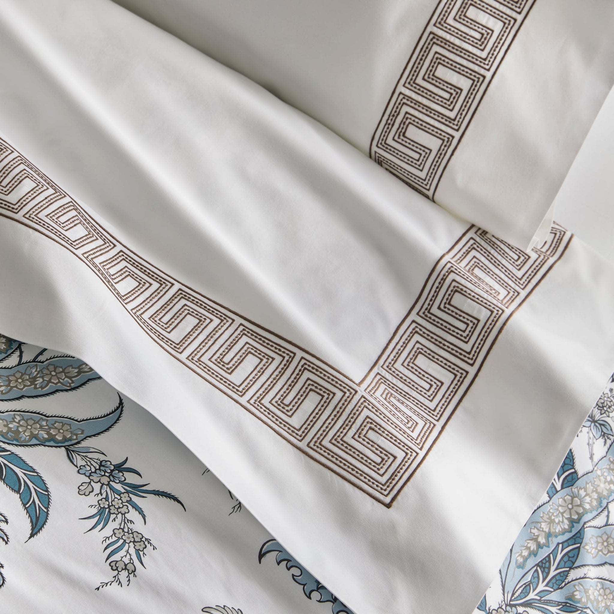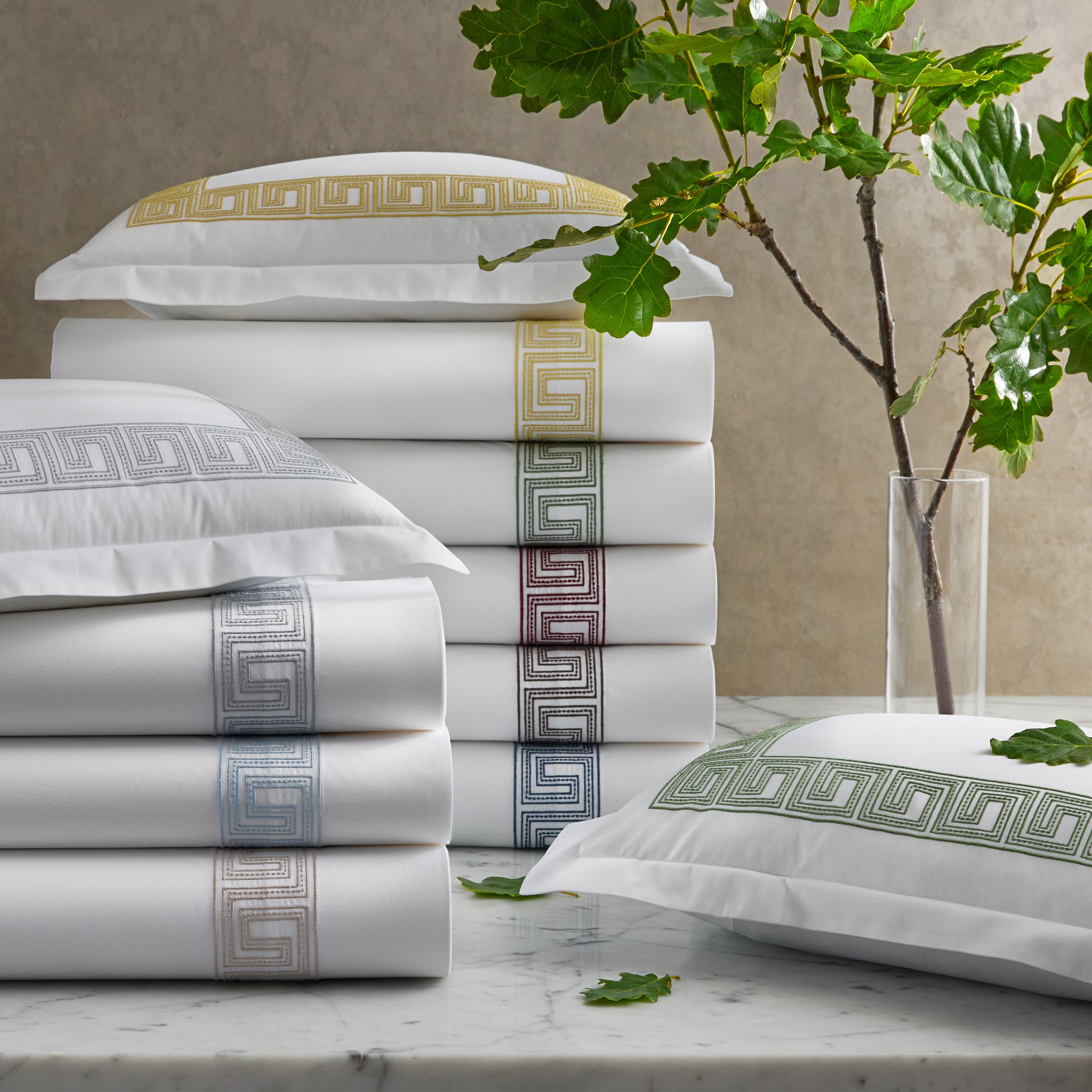 A timeless Greek key pattern is reimagined on Matouk's Ophelia Sheets, Duvet Covers, and Shams. Crafted from crisp white 520 thread count Ceylon percale with embroidery inspired by a meticulous Schumacher beaded tape. Designed with a series of embroidered lines and dots in an array of beautiful colors to create a classic look for the refined bedroom.