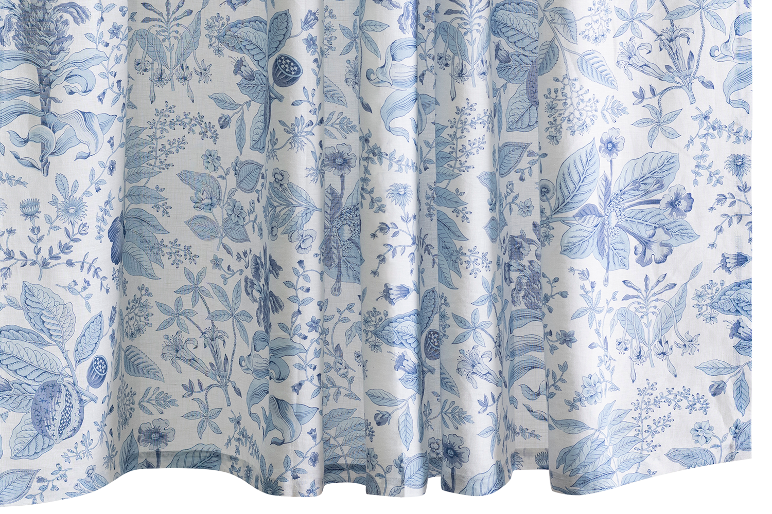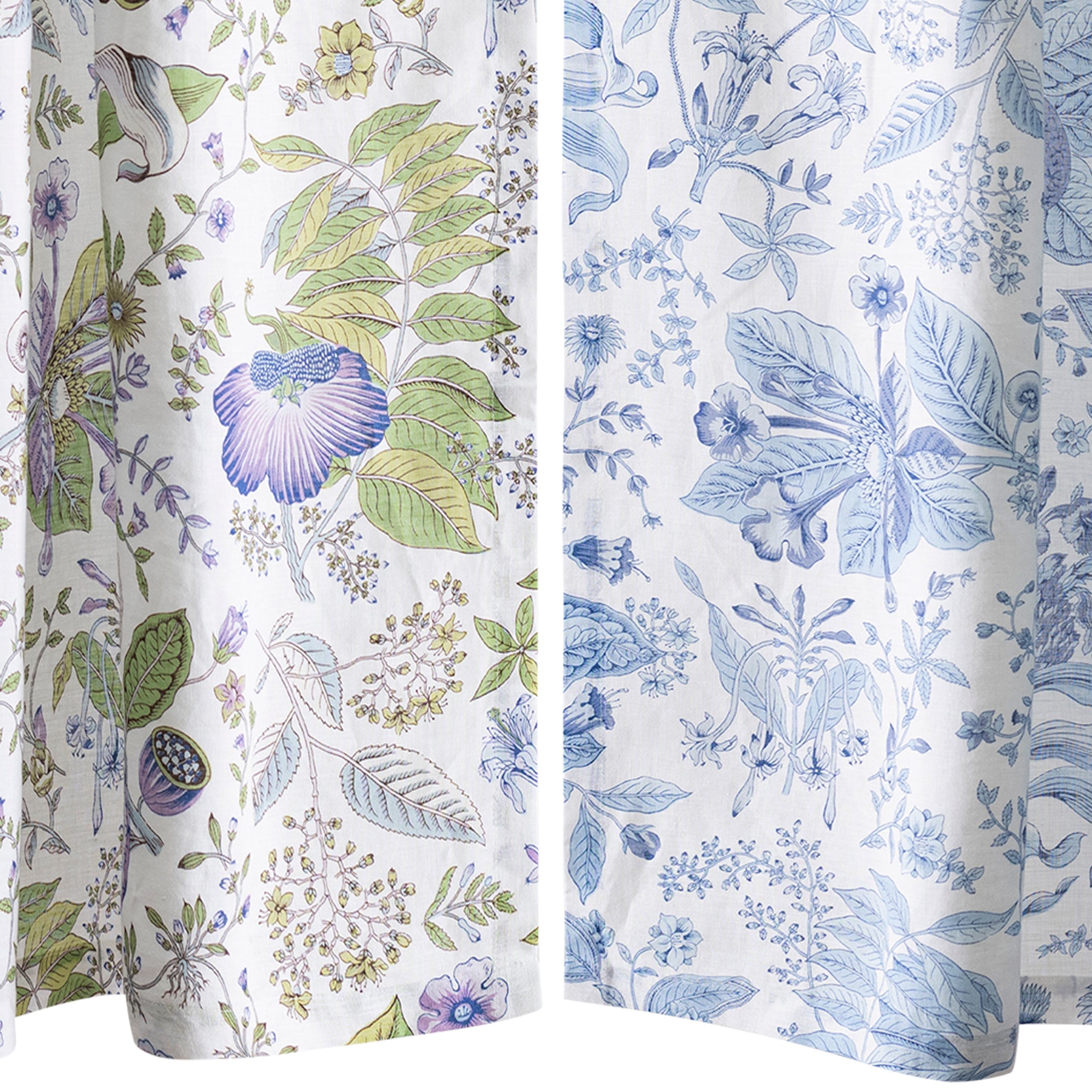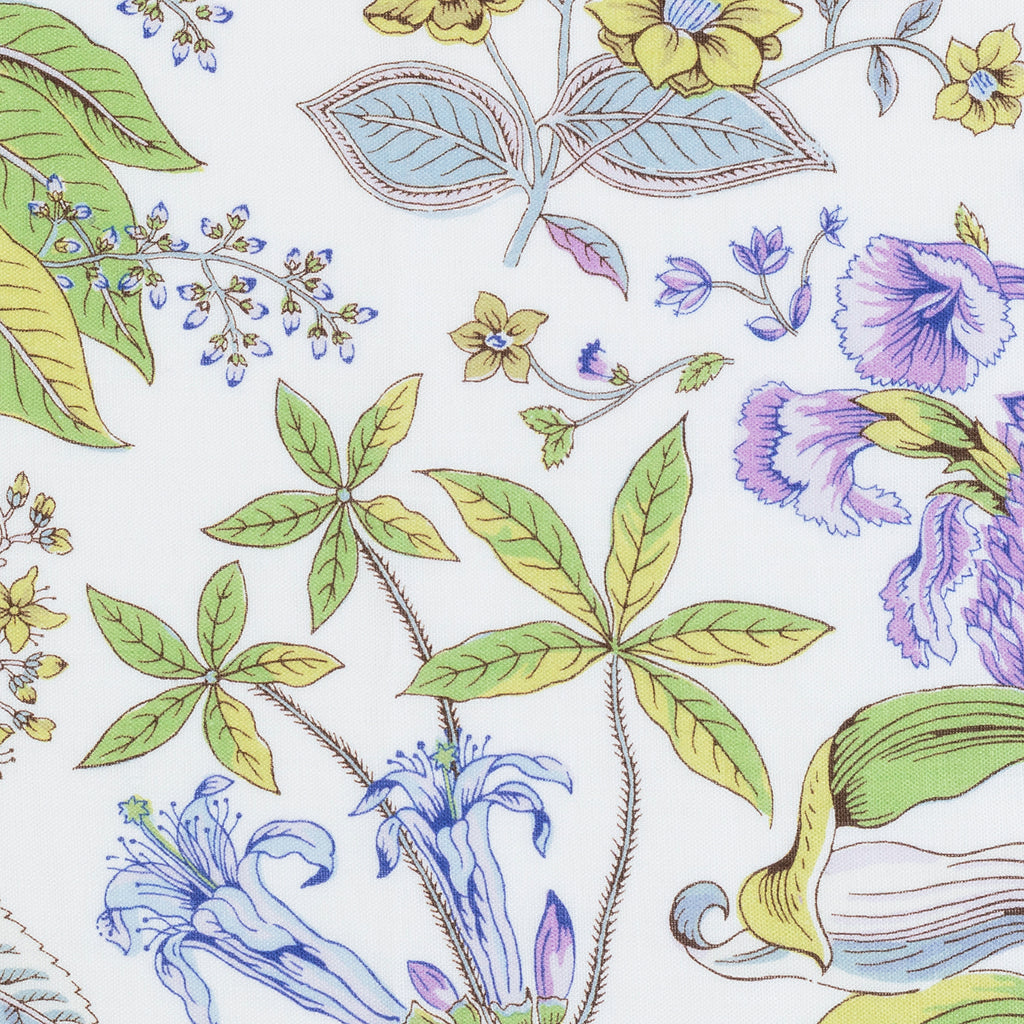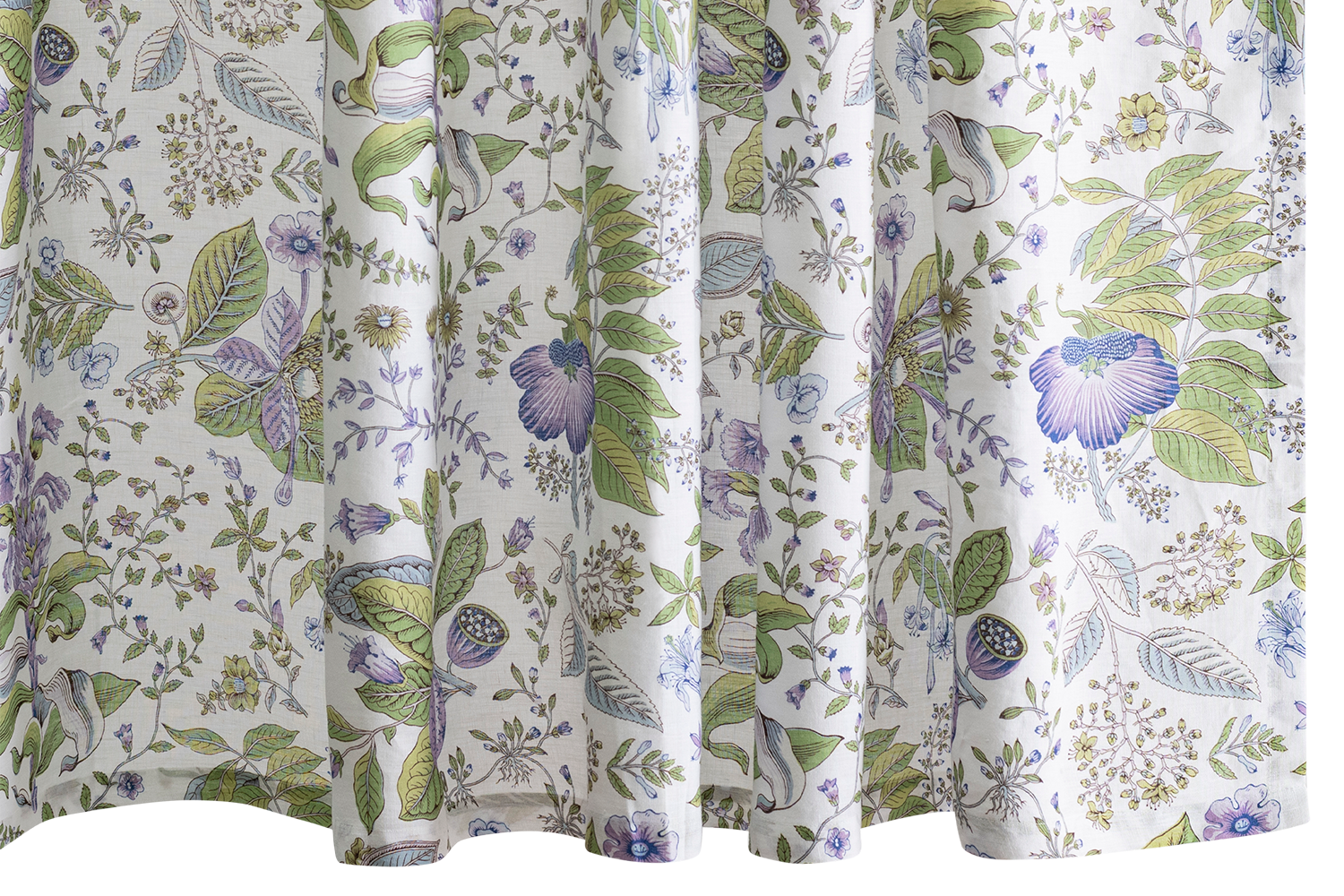 • Schumacher's botanical pattern in hues of purple, green, and blue printed on Matouk's supple and soft Italian woven linen