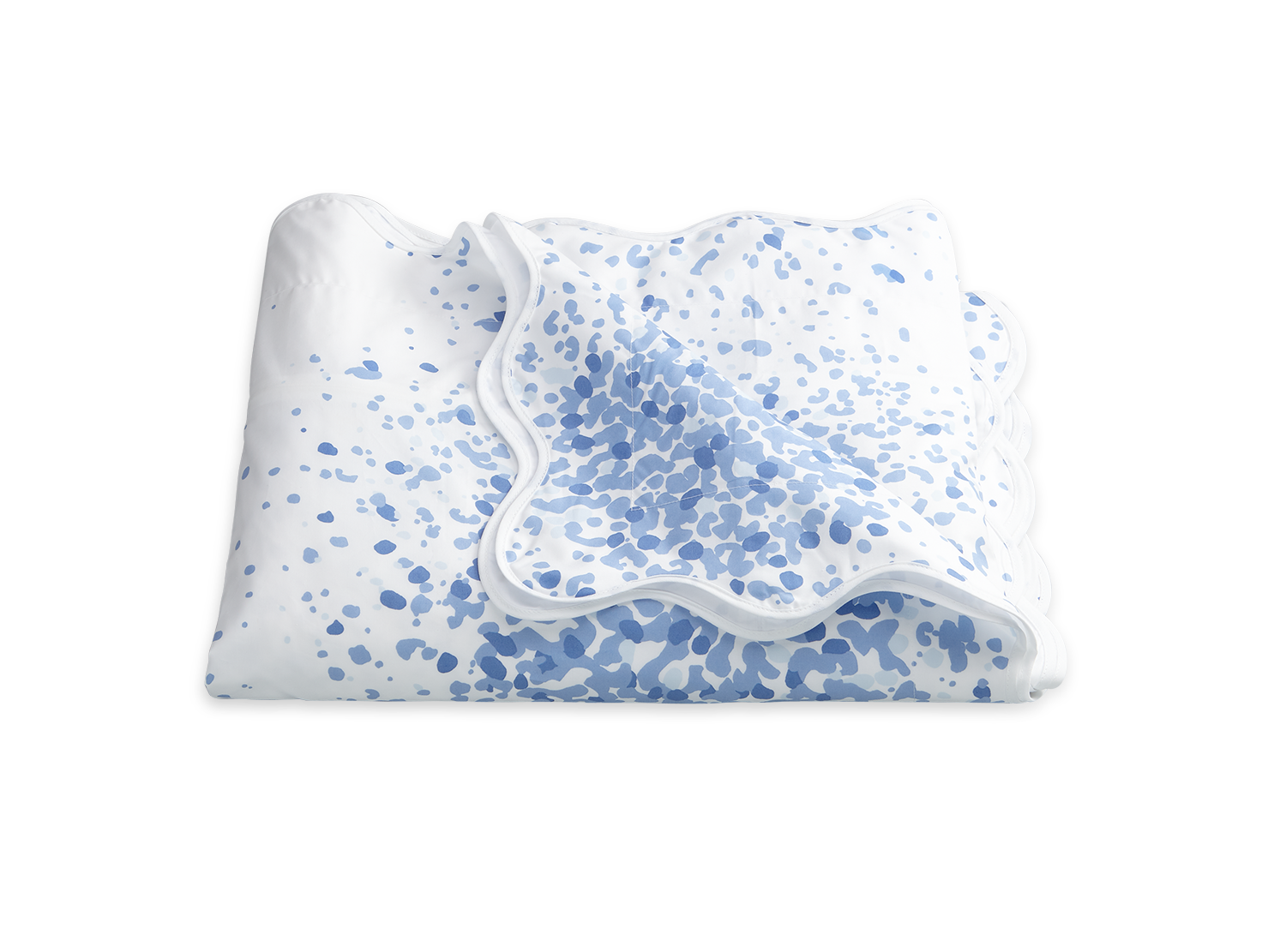 Lulu DK's iconic hydrangea inspired bedding print in azure blue printed on Matouk's Luca luxury percale bedding