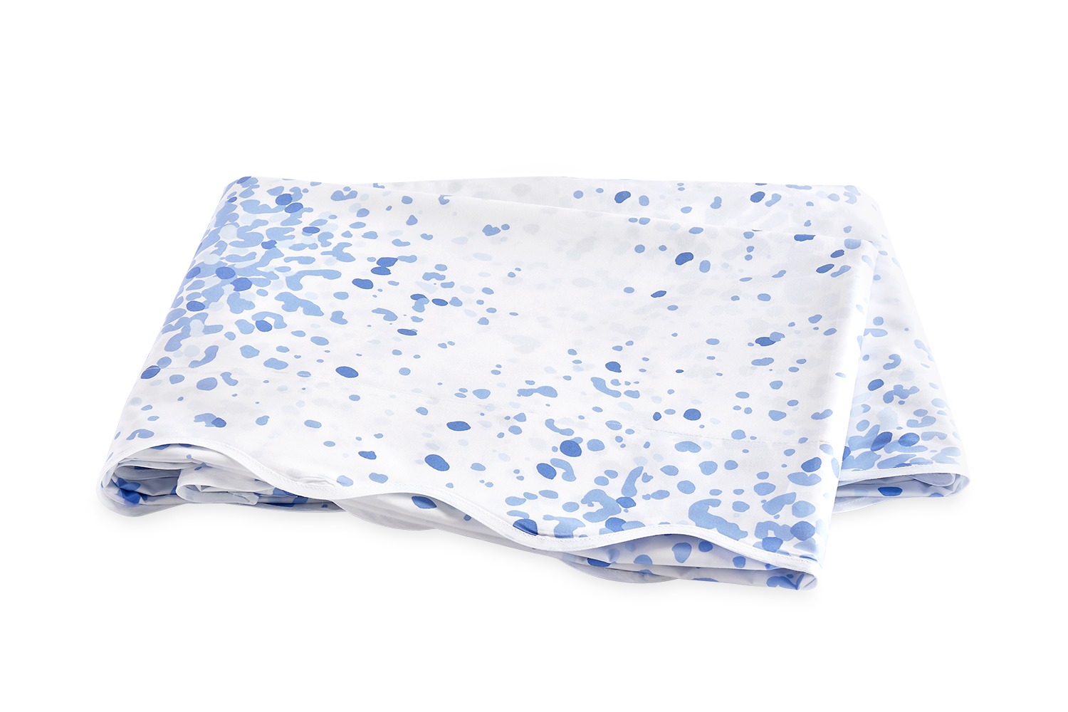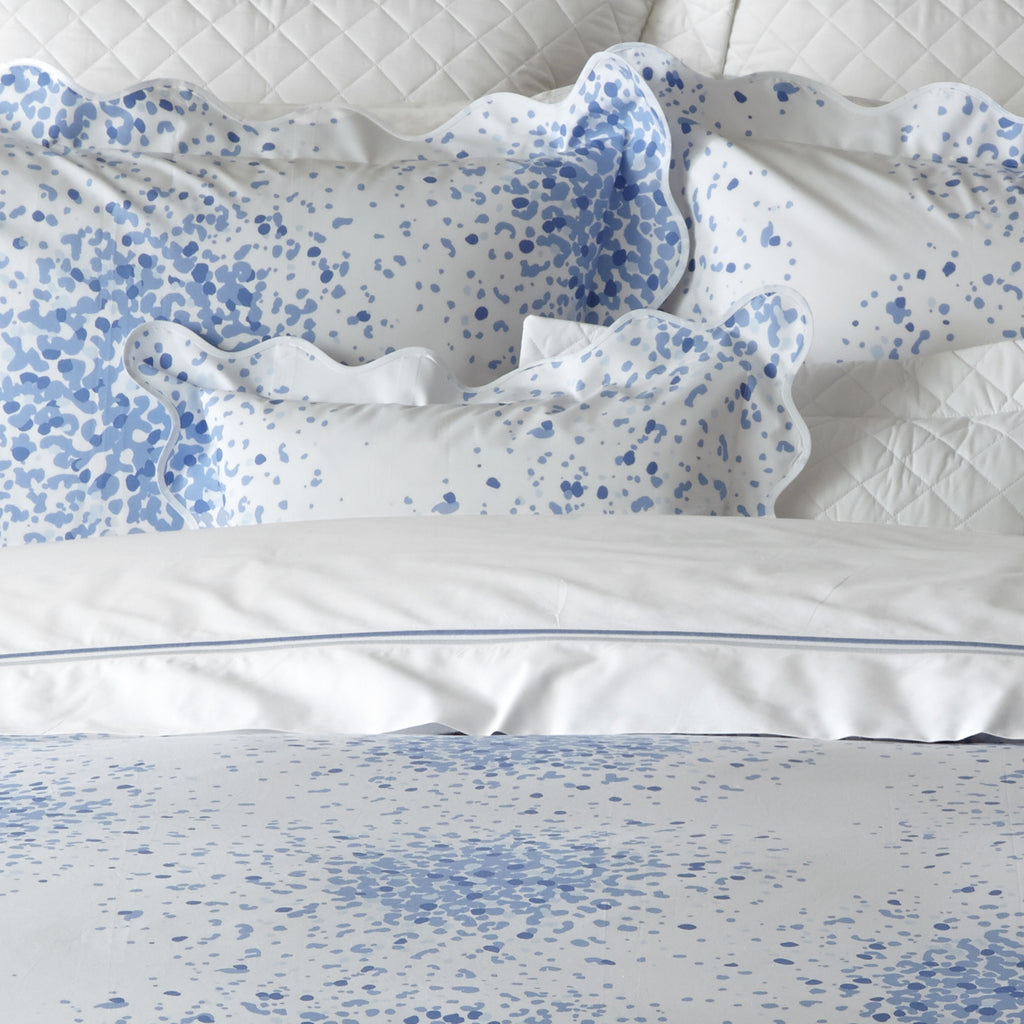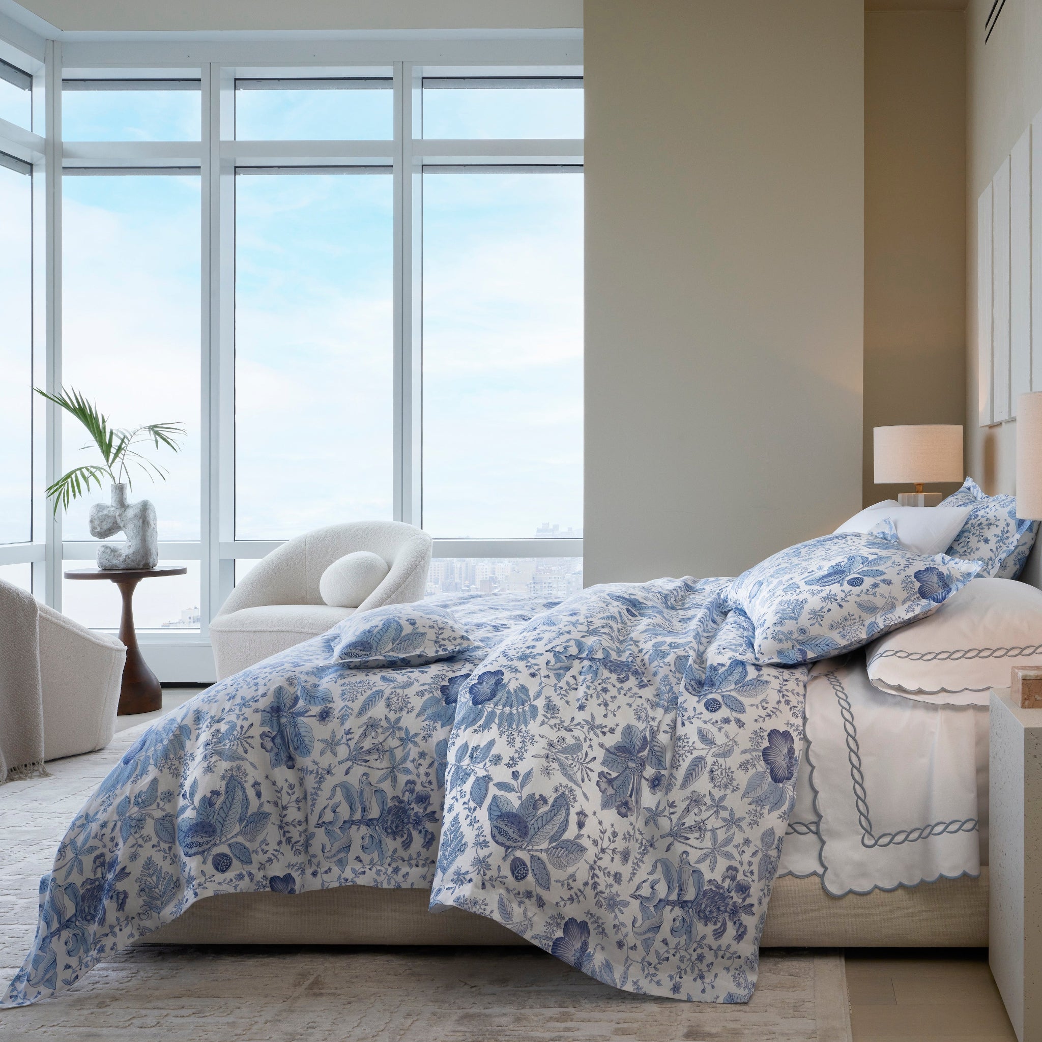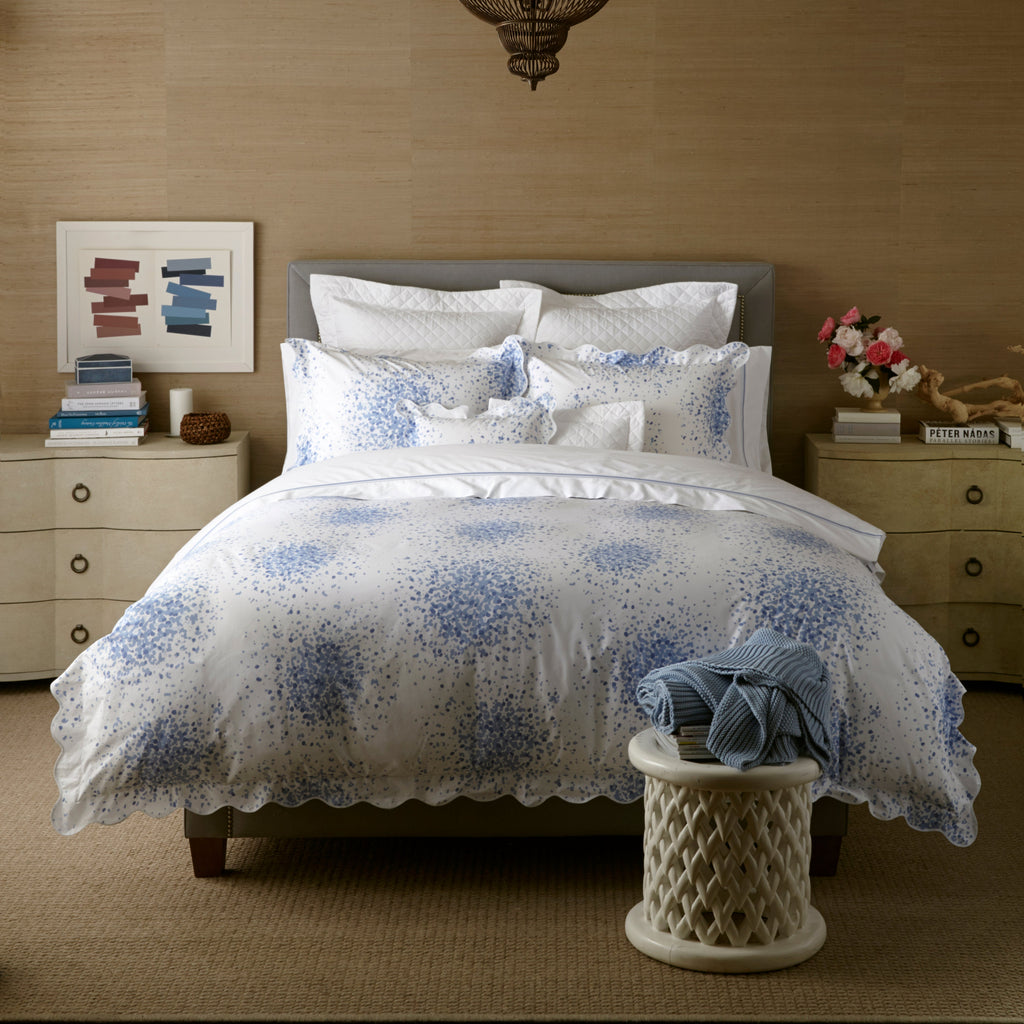 Lulu DK's iconic hydrangea inspired bedding print in azure blue printed on Matouk's Luca luxury percale bedding