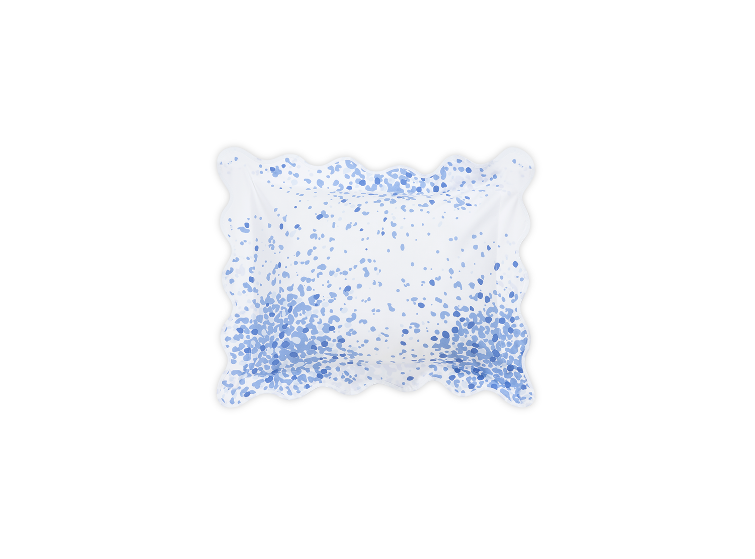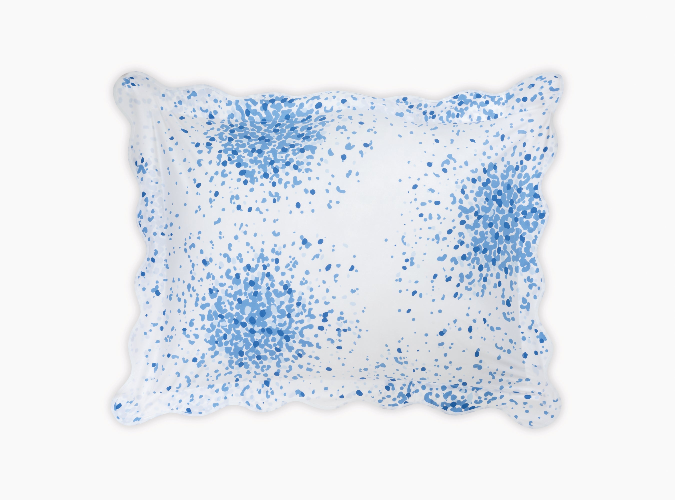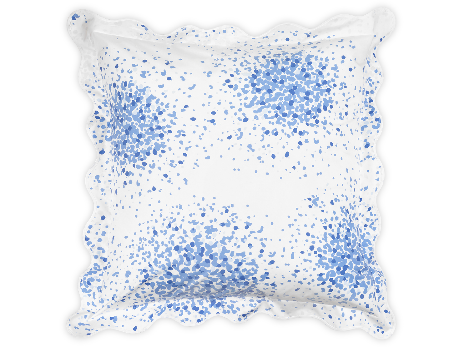 Lulu DK's iconic hydrangea inspired bedding print in azure blue printed on Matouk's Luca luxury percale bedding