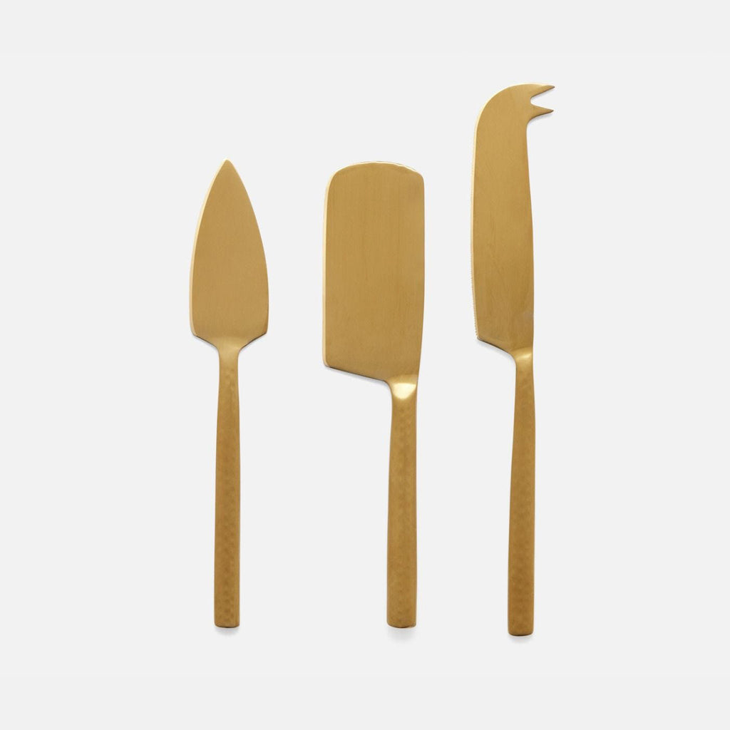 - 3 piece cheese knife set with hammered handles stainless steel construction and matte gold finish