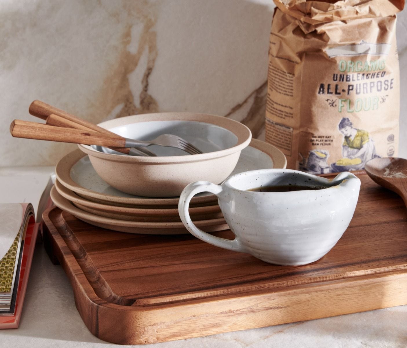 - Glossy white salt glaze finish accented by roughly textured natural stoneware edges
