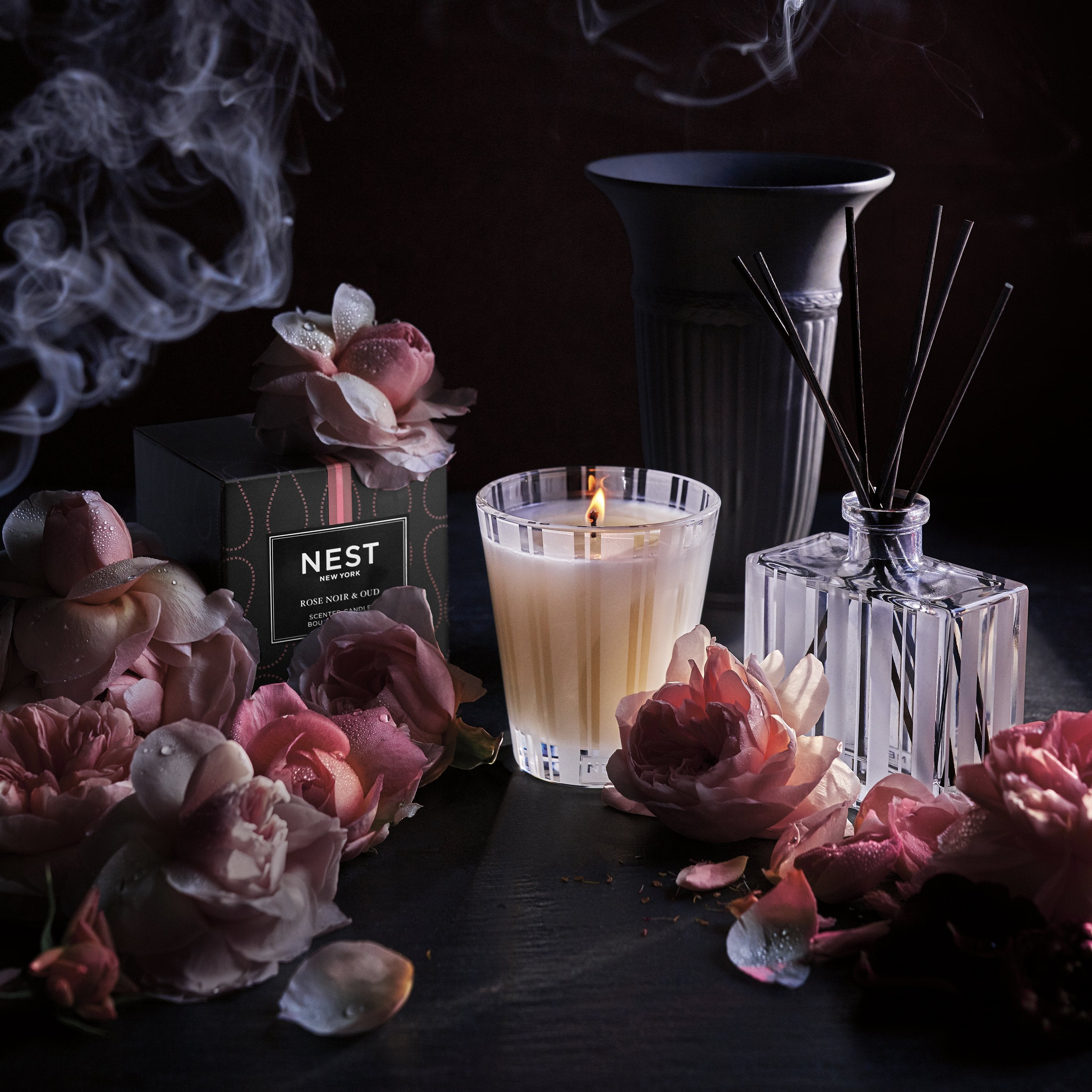 - Woody floral blend of captivating Rose de Mai and smoky oud. A hint of incense, black leather and patchouli