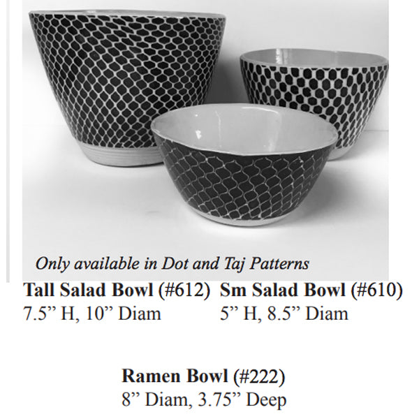 - Tall Salad Bowl: 10" diameter x 7.5" H