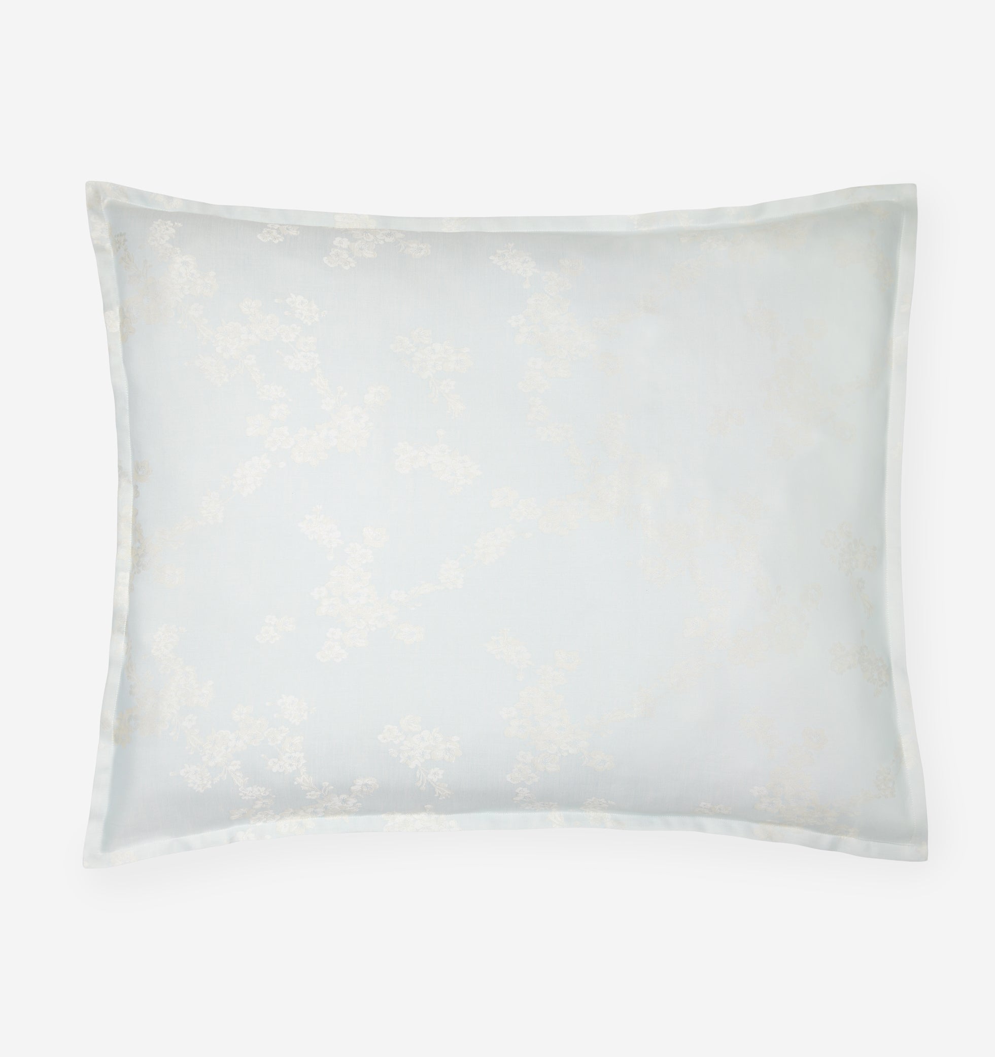 • Soft white blooms are woven across a light blue sateen base for peaceful springtime serenity