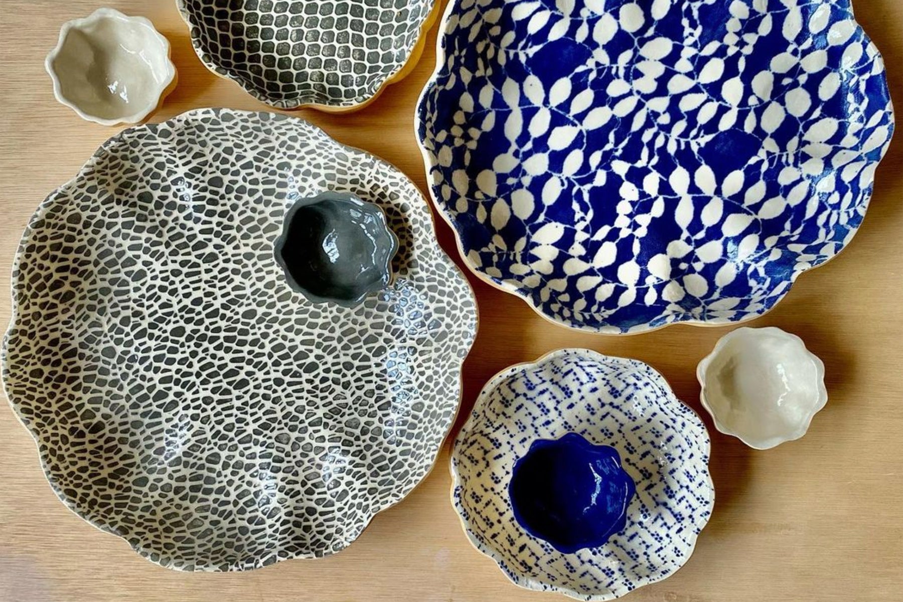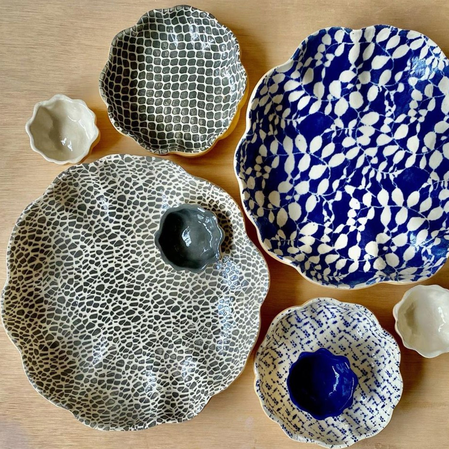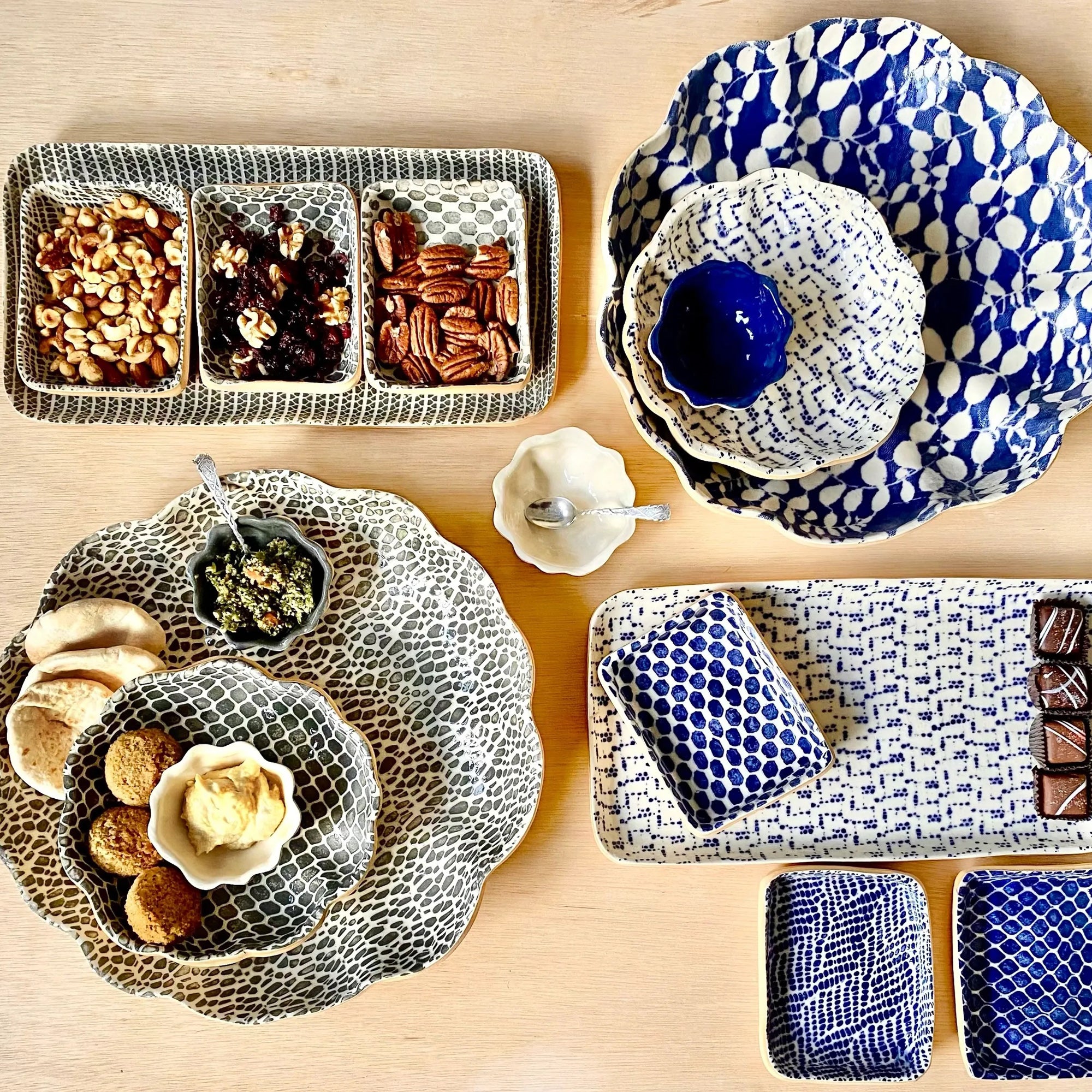 - Mini Scallop Bowl: 3.75" diameter x 1.5" high, solid only, no pattern.