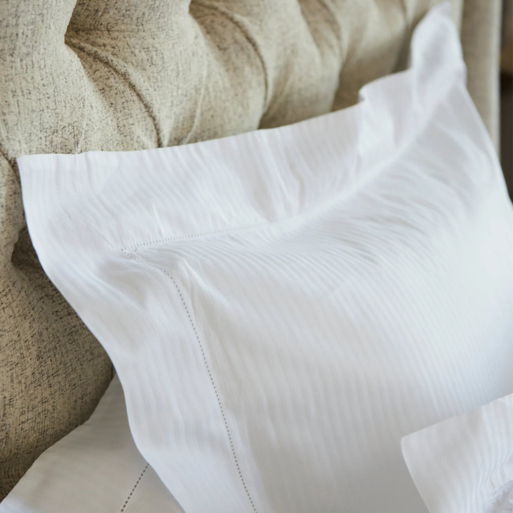 A Scandia Home customer favorite, Savoia collection of fine linens is a nod to the Italian traditions of art and craftsmanship. The finest mills and weavers in Italy combine extra-long-staple cotton yarns (combed for softness) and time-honored techniques to create sheeting with a silky-smooth handfeel and a subtle sheen. Tonal dobby stripes decorate each piece, while a double-stitched border finishes the flat sheet, pillowcases, and shams. Offered in a trio of classic colors.