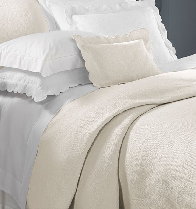 - Classic matelassé of subtle raised flower and vine pattern in soft cotton