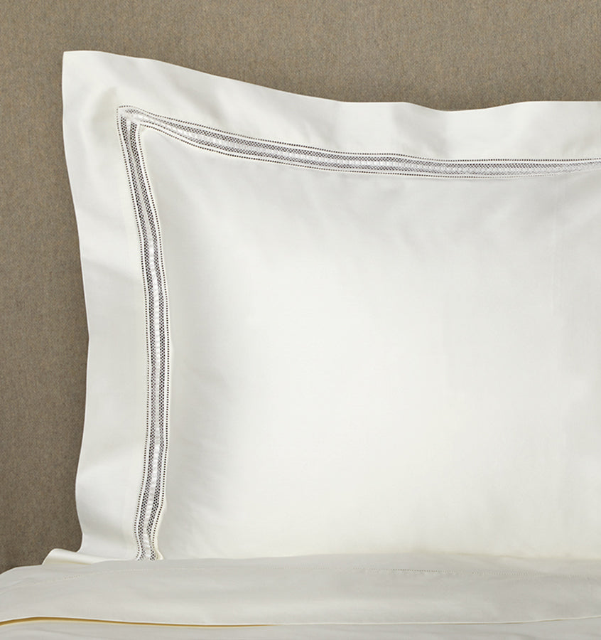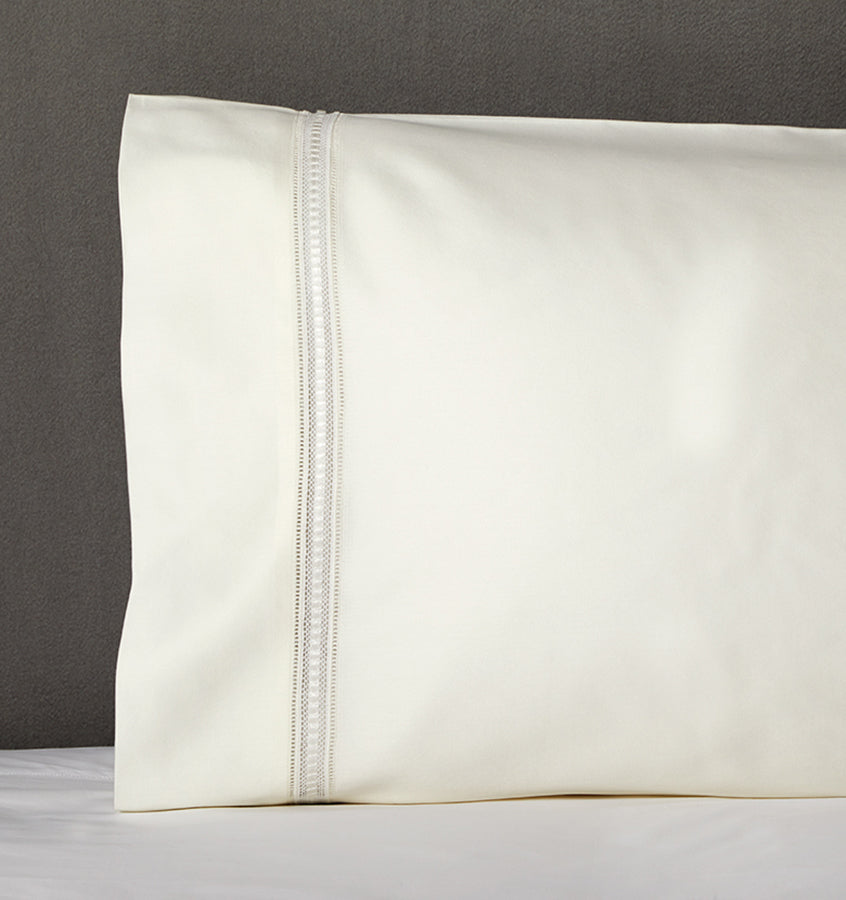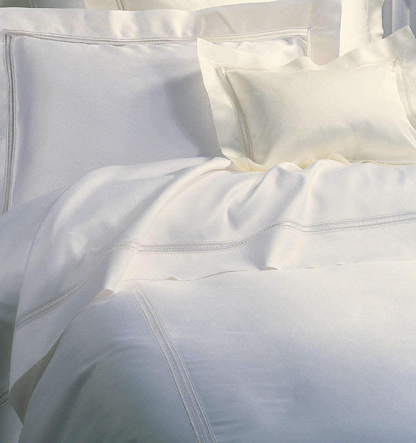 - Luxuriously sleek, Giotto sateen sheeting with macramé lace inset and a narrow threaded satin ribbon detail. The lace is stitched on both sides with delicate hemstitching for a refined and elegant bed.