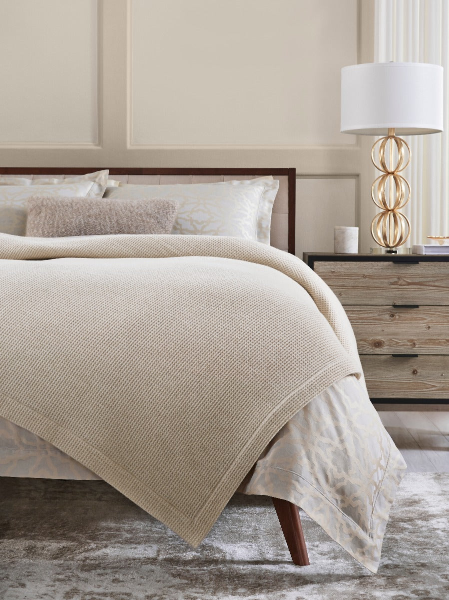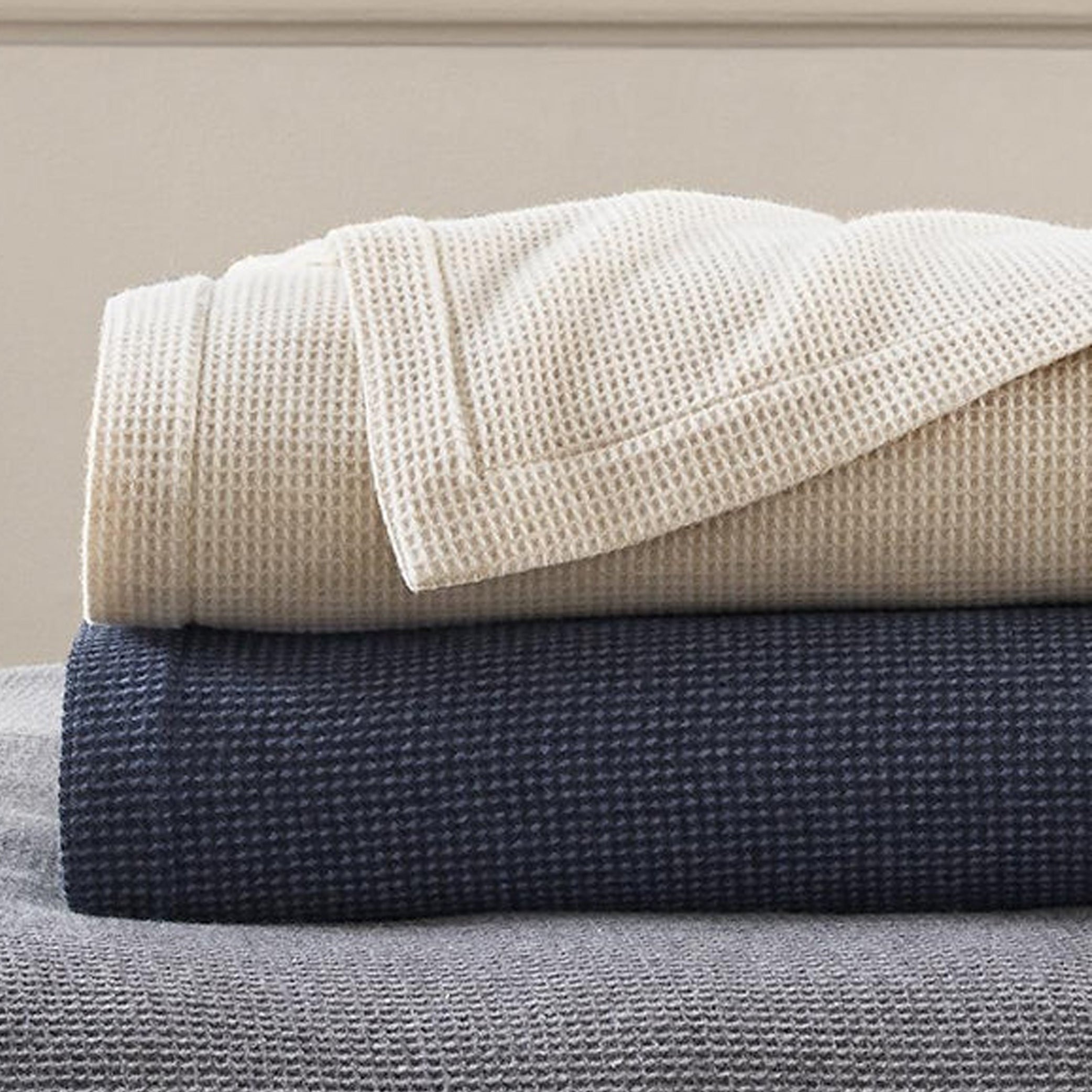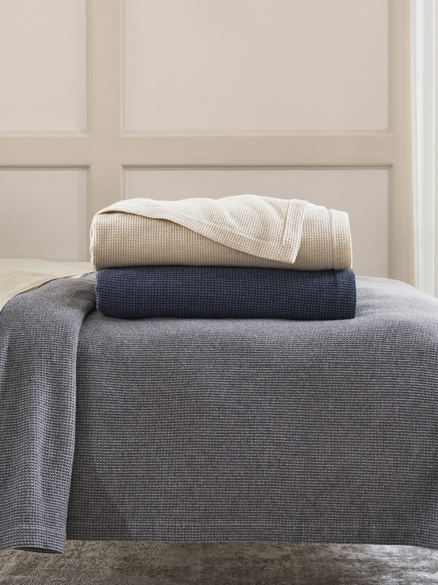 • A quiet fashion statement. Color and texture in a lightweight, luxurious blanket. Traditional waffle weave (known to hold warmth) and two tones of fine merino wool. Understated rich tone and texture.