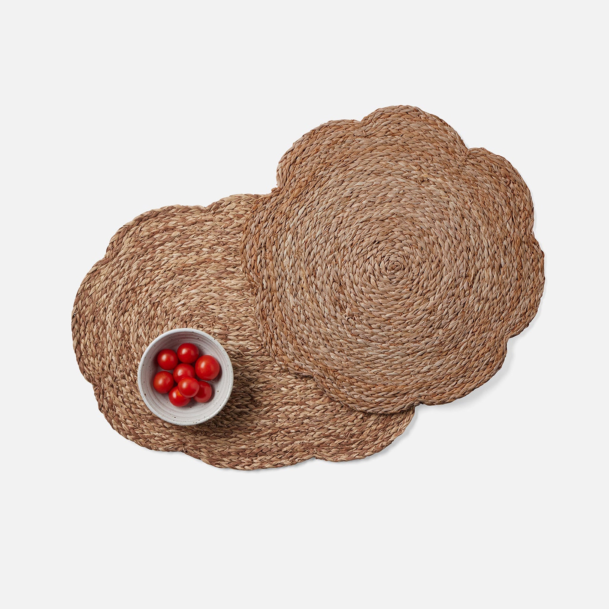 - Scallop floral woven raffia flower placemat in mixed taupe hues