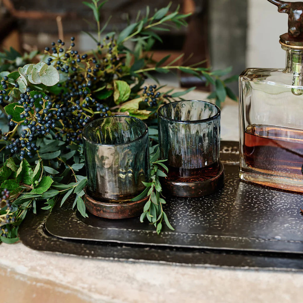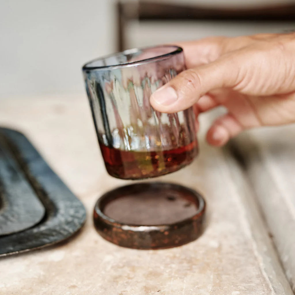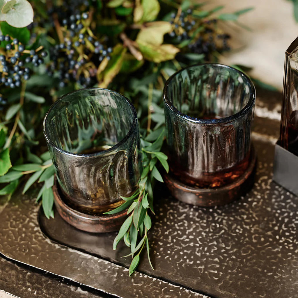 Mouth blown acanalada double old-fashioned glass in azure resting in a detachable wax cast coaster.