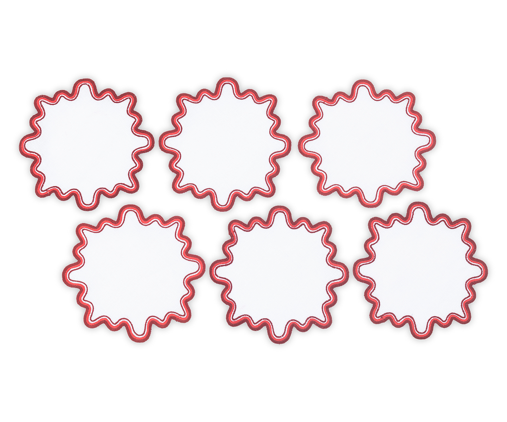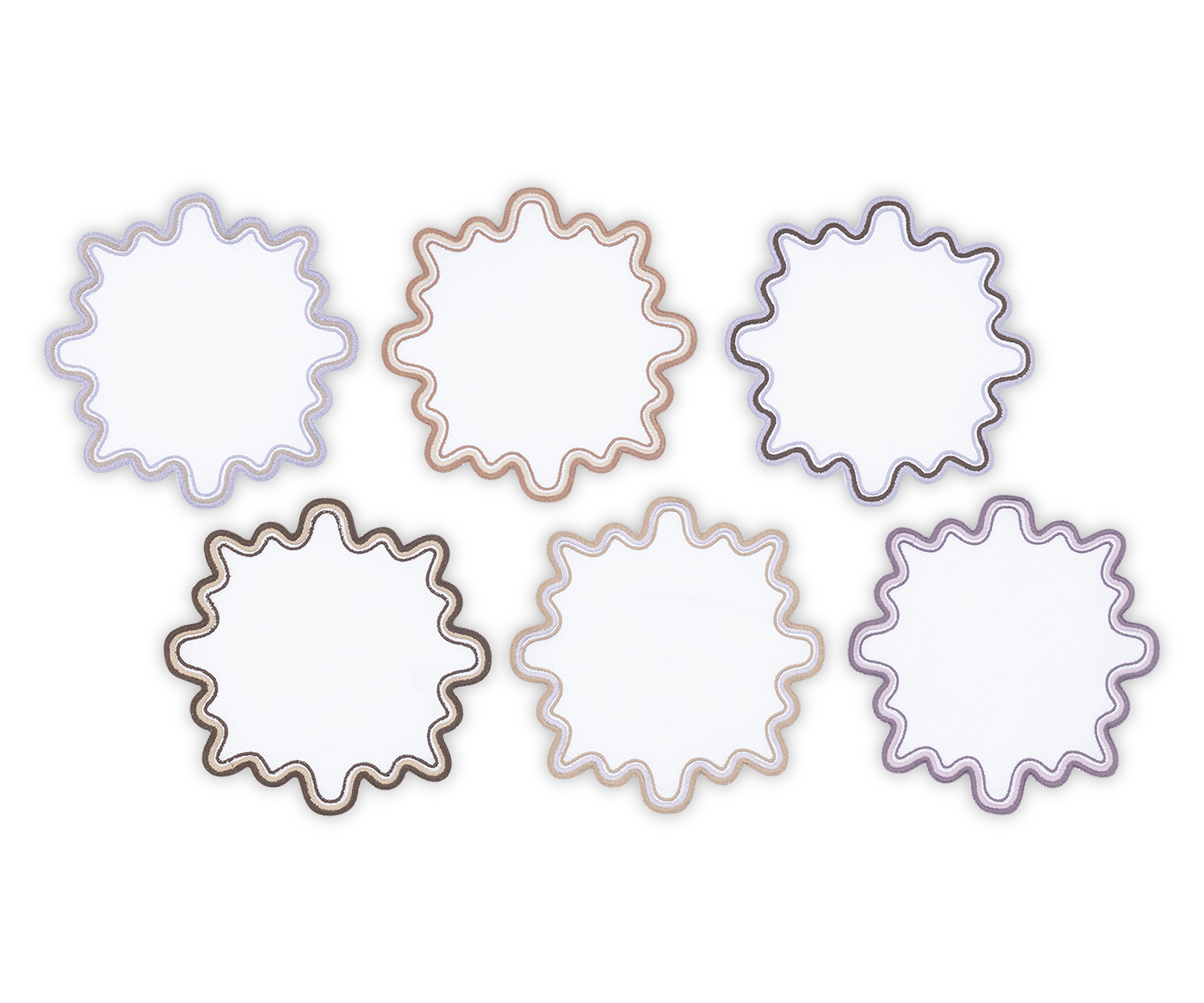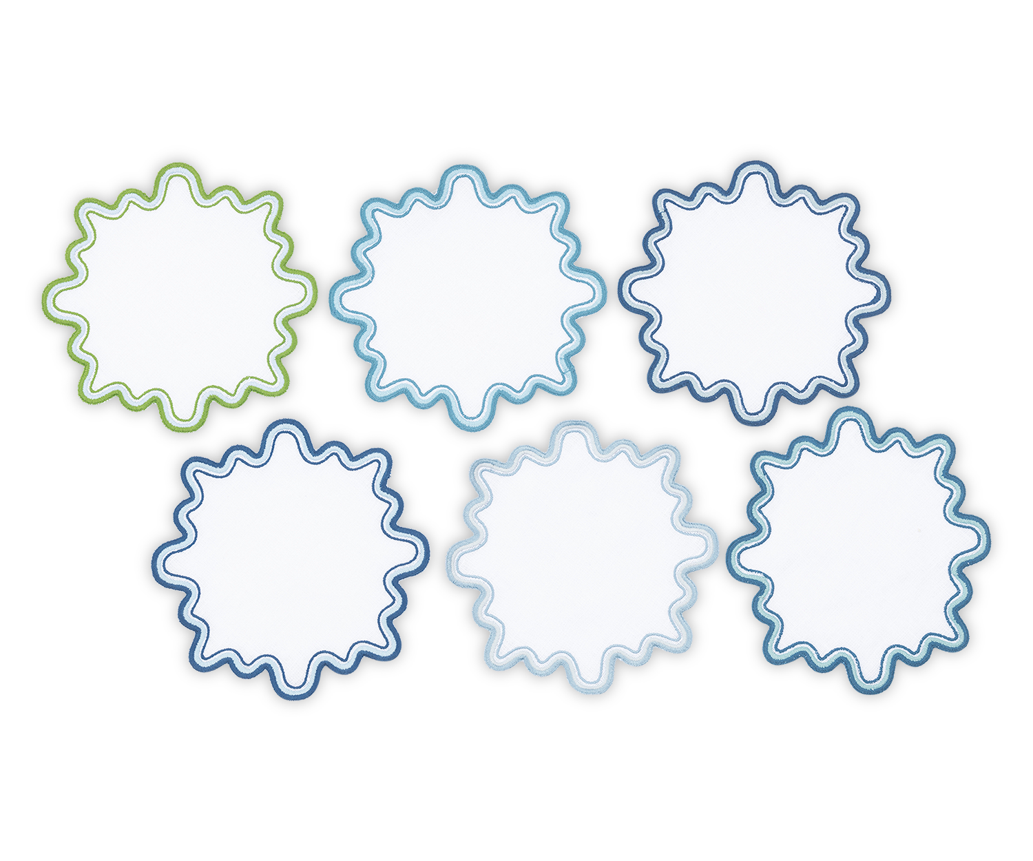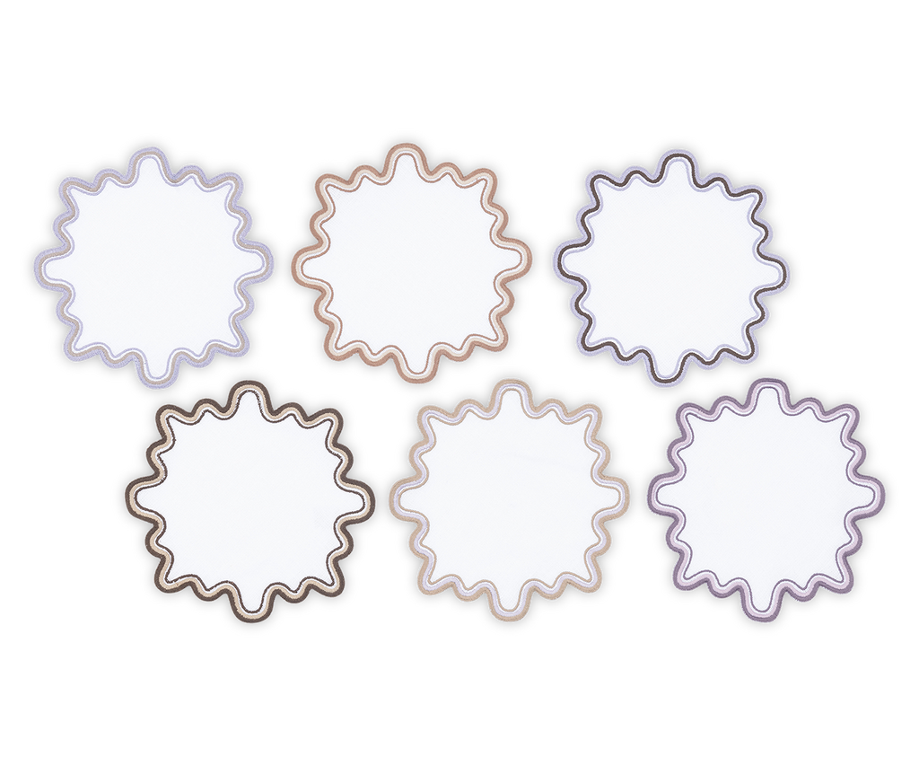 - Playful white linen cocktail napkin set with wave like edge embroidery in a set of complementing colors