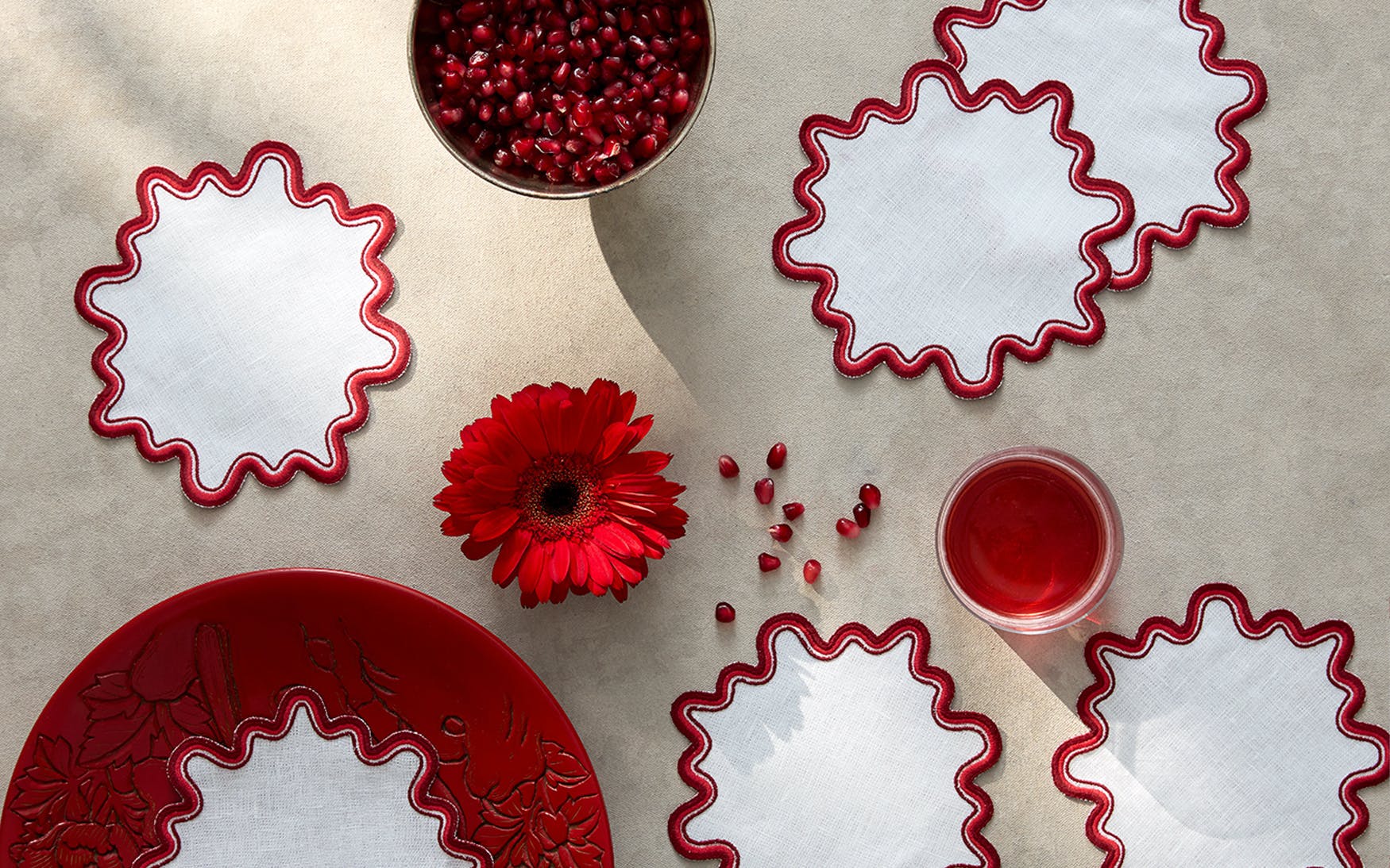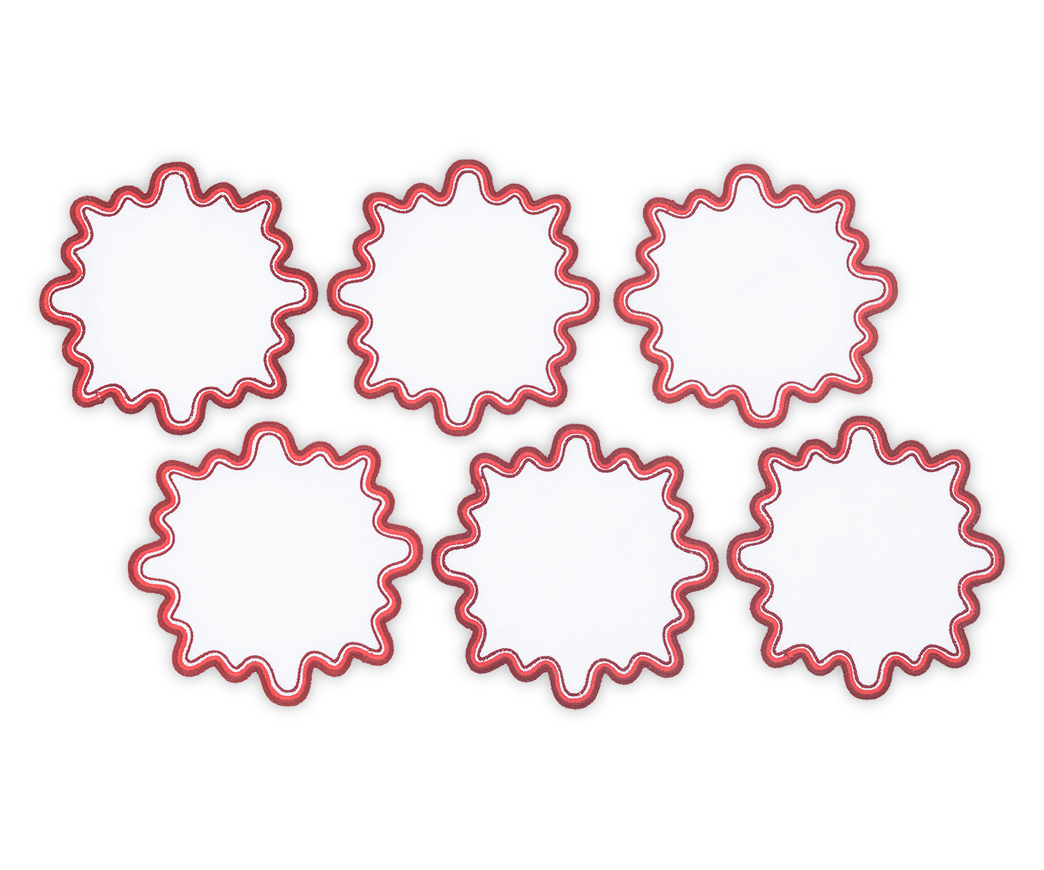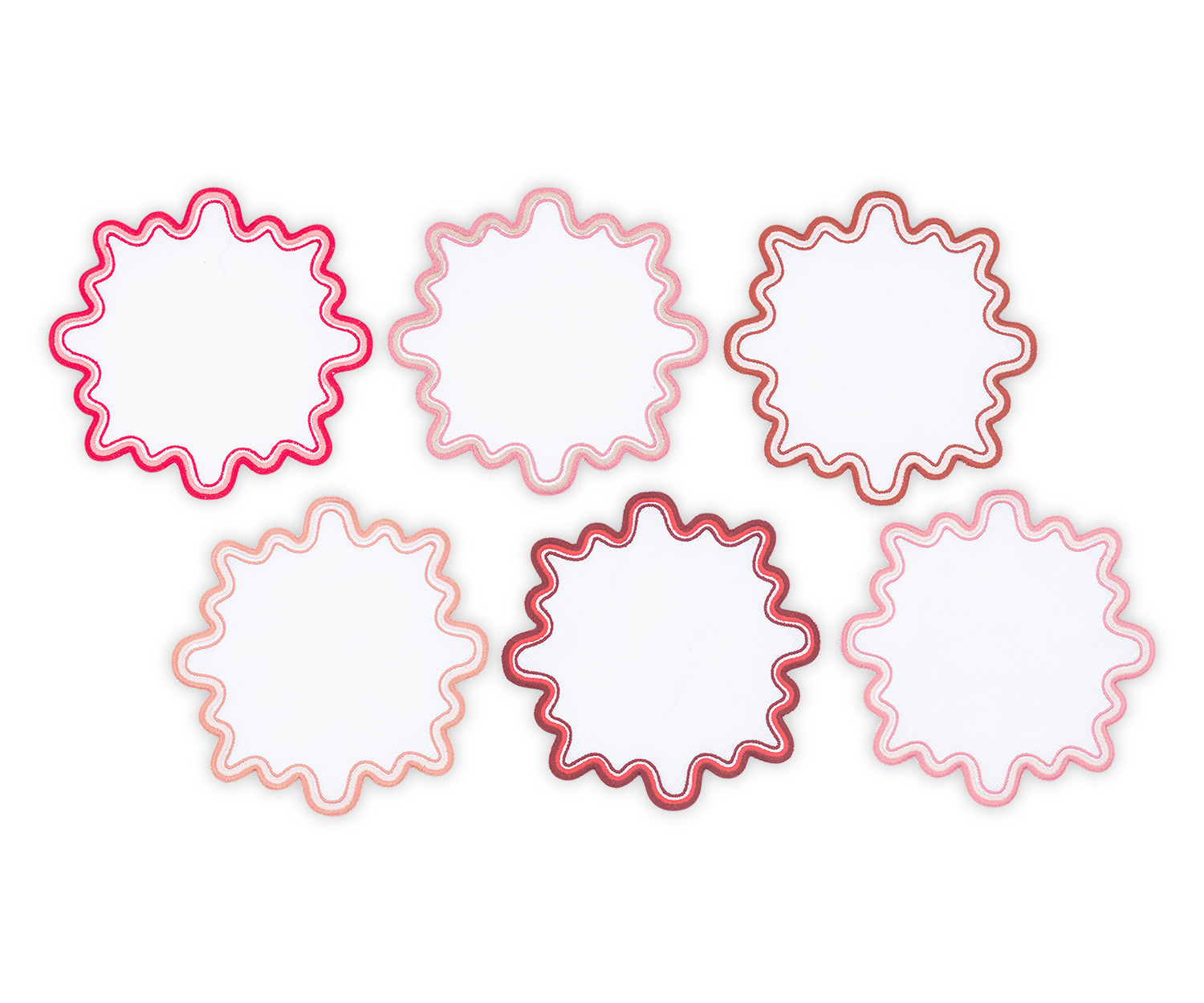 - Playful white linen cocktail napkin set with wave like edge embroidery in a set of complementing colors