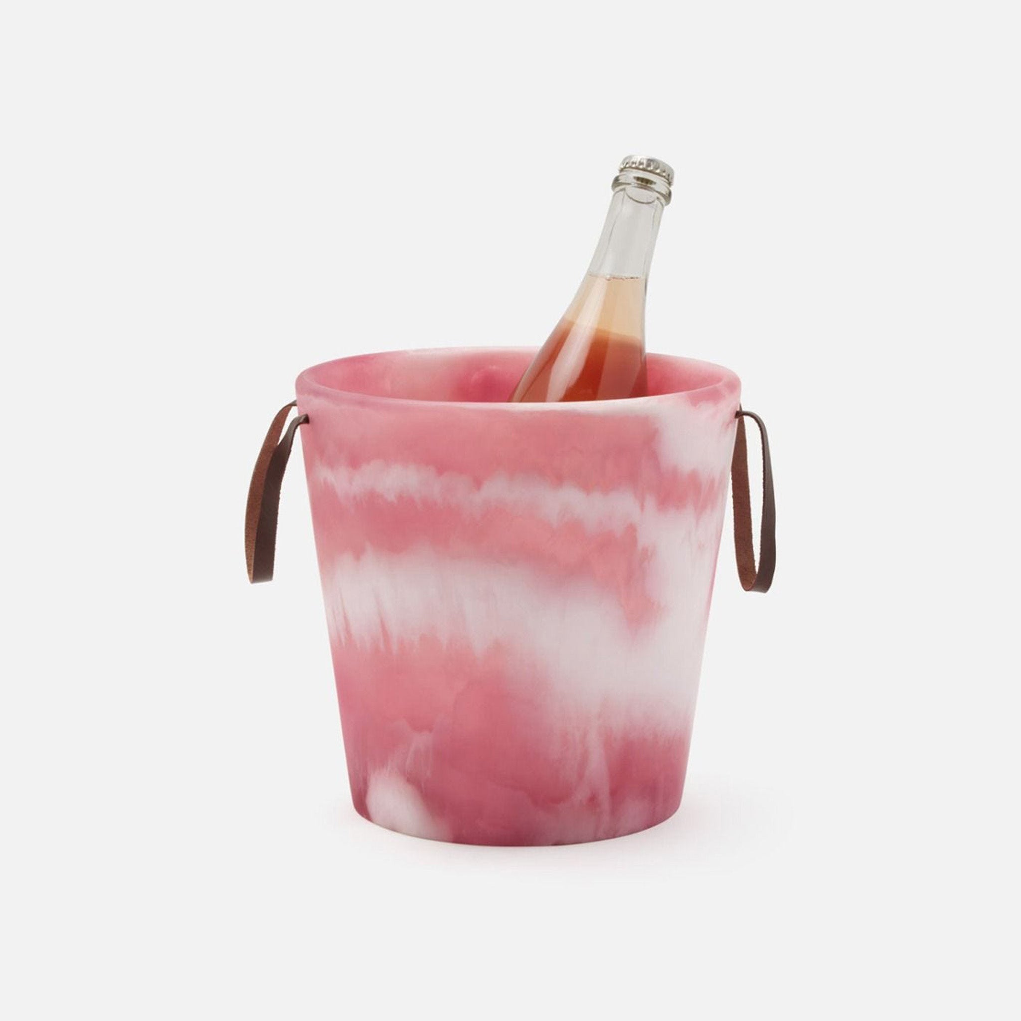 - Marbleized pink and white resin ice bucket or bottle chiller with knotted leather handles
